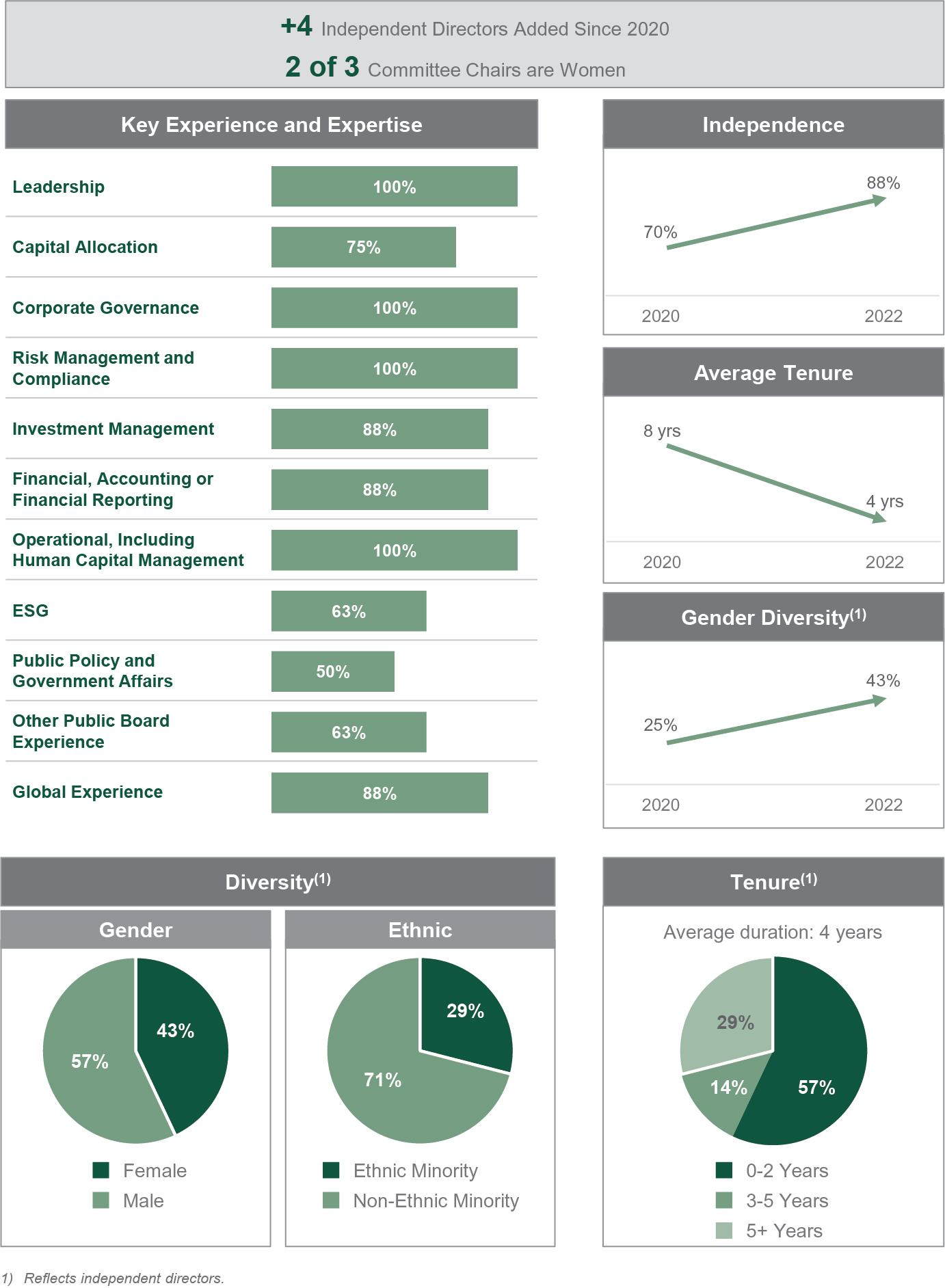 • Four of the seven independent directors are new since 2020 • New Chairs of all three Board committees, and new members placed on each committee, since 2020 • Fully reconstituted Compensation Committee in 2020 |