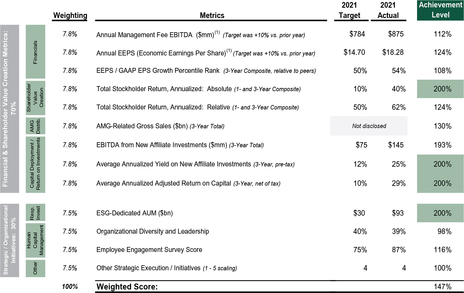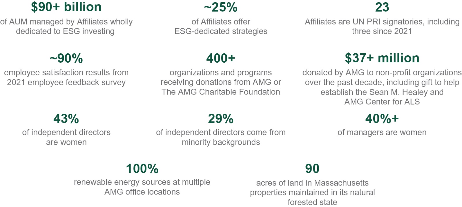 • In 2021 and 2022YTD, AMG held approximately 140 meetings with stockholders representing approximately 70% of our voting shares, on topics including corporate strategy, ESG, and executive compensation |