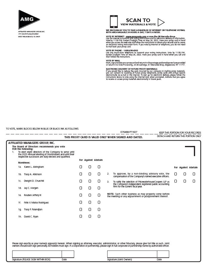 Logo AFFILIATED MANAGERS GROUP, INC. 777 SOUTH FLAGLER DRIVE WEST PALM BEACH, FL 33401 SCAN TO VIEW MATERIALS & VOTE WE ENCOURAGE YOU TO TAKE ADVANTAGE OF INTERNET OR TELEPHONE VOTING. BOTH ARE AVAILABLE 24 HOURS A DAY, 7 DAYS A WEEK. VOTE BY INTERNET - www.proxyvote.com or scan the QR Barcode above Use the Internet to transmit your voting instructions and for electronic delivery of information. Vote by 11:59 P.M. Eastern Daylight Time on May 26, 2022. Have your proxy card in hand when you access the web site and follow the instructions to obtain your records and to create an electronic voting instruction form. If you vote by Internet or telephone, you do not need to mail back your proxy card. VOTE BY PHONE - 1-800-690-6903 Use any touch-tone telephone to transmit your voting instructions. Vote by 11:59 P.M. Eastern Daylight Time on May 26, 2022. Have your proxy card in hand when you call and then follow the instructions. VOTE BY MAIL Mark, sign and date your proxy card and return it in the postage-paid envelope we have provided or return it to Vote Processing, c/o Broadridge, 51 Mercedes Way, Edgewood, NY 11717. ELECTRONIC DELIVERY OF FUTURE PROXY MATERIALS If you would like to reduce the costs incurred by our company in mailing proxy materials, you can consent to receiving all future proxy statements, proxy cards and annual reports electronically via e-mail or the Internet. To sign up for electronic delivery, please follow the instructions above to vote using the Internet and, when prompted, indicate that you agree to receive or access proxy materials electronically in future years. TO VOTE, MARK BLOCKS BELOW IN BLUE OR BLACK INK AS FOLLOWS: D76488-P71827 KEEP THIS PORTION FOR YOUR RECORDS THIS PROXY CARD IS VALID ONLY WHEN SIGNED AND DATED. DETACH AND RETURN THIS PORTION ONLY AFFILIATED MANAGERS GROUP, INC. The Board of Directors recommends you vote FOR the following 1. To elect eight directors of the Company to serve until the 2023 Annual Meeting of Stockholders and until their respective successors are duly elected and qualified For Against Abstain For Against Abstain Nominees:1a. Karen L. Alvingham 1b. Tracy A. Atkinson 1c. Dwight D. Churchill 1d. Jay C. Horgen 1e. Reuben Jeffery III 1f. Félix V. Matos Rodríguez 1g. Tracy P. Palandjian 1h. David C. Ryan 2. To approve, by a non-binding advisory vote, the compensation of the Company’s named executive officers. 3. To ratify the selection of PricewaterhouseCoopers LLP as the Company’s independent registered public accounting firm for the current fiscal year. NOTE: Such other business as may properly come before the meeting or any adjournment or postponement thereof. Please sign exactly as your name(s) appear(s) hereon. When signing as attorney, executor, administrator, or other fiduciary, please give full title as such. Joint owners should each sign personally. All holders must sign. If a corporation or partnership, please sign in full corporate or partnership name by authorized officer. Signature [PLEASE SIGN WITHIN BOX] Date Signature (Joint Owners) Date