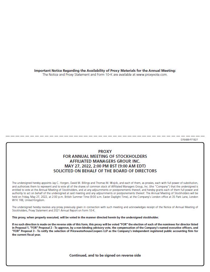 Important Notice Regarding the Availability of Proxy Materials for the Annual Meeting: The Notice and Proxy Statement and Form 10-K are available at www.proxyvote.com. D76489-P71827 PROXY FOR ANNUAL MEETING OF STOCKHOLDERS AFFILIATED MANAGERS GROUP, INC. MAY 27, 2022, 2:00 PM BST (9:00 AM EDT) SOLICITED ON BEHALF OF THE BOARD OF DIRECTORS The undersigned hereby appoints Jay C. Horgen, David M. Billings and Thomas M. Wojcik, and each of them, as proxies, each with full power of substitution, and authorizes them to represent and to vote all of the shares of common stock of Affiliated Managers Group, Inc. (the "Company") that the undersigned is entitled to vote at the Annual Meeting of Stockholders, and at any adjournments or postponements thereof, and hereby grants each of them full power and authority to act on behalf of the undersigned at said meeting and any adjournments or postponements thereof. The Annual Meeting of Stockholders will be held on Friday, May 27, 2022, at 2:00 p.m. British Summer Time (9:00 a.m. Easter Daylight Time), at the Company's London office at 35 Park Lane, London W1K 1RB, United Kingdom. The undersigned hereby revokes any proxy previously given in connection with such meeting and acknowledges receipt of the Notice of Annual Meeting of Stockholders, Proxy Statement and 2021 Annual Report on Form 10-K. This proxy, when properly executed, will be voted in the manner directed herein by the undersigned stockholder. If no such direction is made on the reverse side of this form, this proxy will be voted "FOR" the election of each of the nominees for director listed in Proposal 1, "FOR" Proposal 2 - To approve, by a non-binding advisory vote, the compensation of the Company's named executive officers, and "FOR" Proposal 3 - To ratify the selection of PricewaterhouseCoopers LLP as the Company's independent registered public accounting firm for the current fiscal year. Continued, and to be signed on reverse side