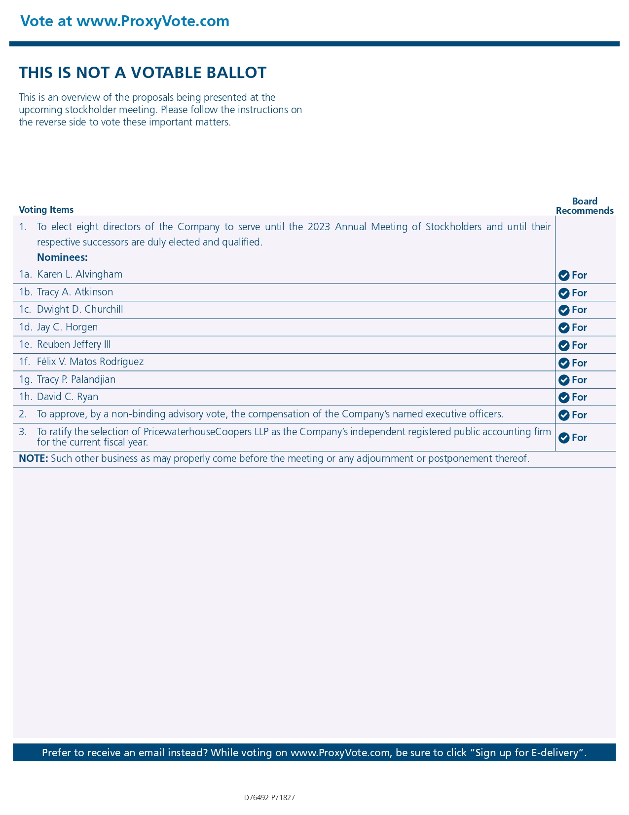 Vote at www.ProxyVote.com THIS IS NOT A VOTABLE BALLOT This is an overview of the proposals being presented at the upcoming stockholder meeting. Please follow the instructions on the reverse side to vote these important matters. Voting Items Board Recommends 1. To elect eight directors of the Company to serve until the 2023 Annual Meeting of Stockholders and until their respective successors are duly elected and qualified. Nominees: 1a. Karen L. Alvingham For 1b. Tracy A. Atkinson For 1c. Dwight D. Churchill For 1d. Jay C. Horgen For 1e. Reuben Jeffery III For 1f. Félix V. Matos Rodríguez For 1g. Tracy P. Palandjian For 1h. David C. Ryan 2. To approve, by a non-binding advisory vote, the compensation of the Company’s named executive officers. For 3. To ratify the selection of PricewaterhouseCoopers LLP as the Company’s independent registered public accounting firm for the current fiscal year. For NOTE: Such other business as may properly come before the meeting or any adjournment or postponement thereof. Prefer to receive an email instead? While voting on www.ProxyVote.com, be sure to click “Sign up for E-delivery”. D76492-P71827