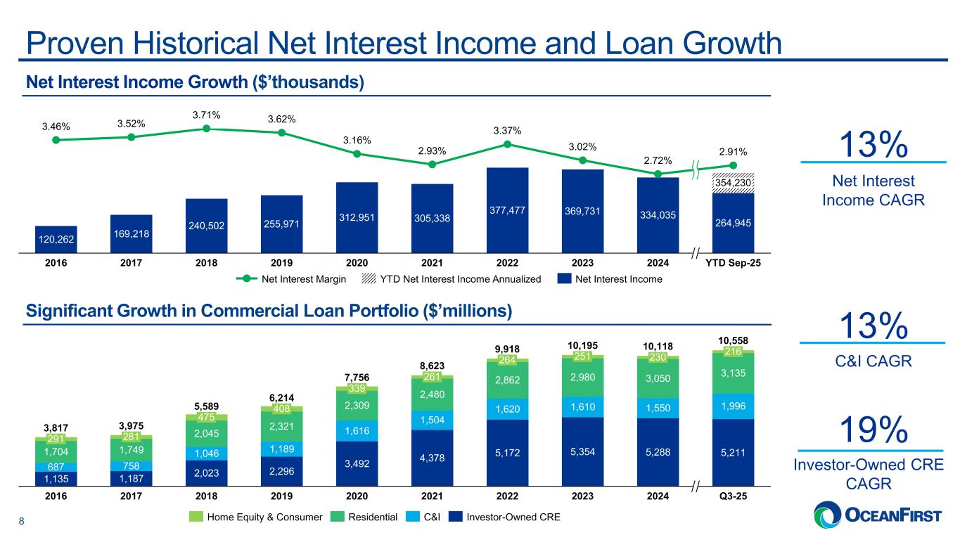 . . .Proven Historical Net Interest Income and Loan Growth 120,262 169,218 240,502 255,971 312,951 305,338 377,477 369,731 334,035 264,945 3.46% 2016 3.52% 2017 3.71% 2018 3.62% 2019 3.16% 2020 2.93% 2021 3.37% 2022 3.02% 2023 2.72% 2024 2.91% 354,230 YTD Sep-25 Net Interest Margin YTD Net Interest Income Annualized Net Interest Income Net Interest Income Growth ($’thousands) Net Interest Income CAGR 13% 1,135 1,187 2,023 2,296 3,492 4,378 5,172 5,354 5,288 5,211 687 758 1,046 1,189 1,616 1,504 1,620 1,610 1,550 1,996 1,704 1,749 2,045 2,321 2,309 2,480 2,862 2,980 3,050 3,135 475 2018 408 2019 339 2020 261 2021 264 2022 251 2023 230 291 216 Q3-25 3,817 3,975 5,589 6,214 7,756 8,623 9,918 10,195 2016 281 2017 10,118 10,558 2024 Home Equity & Consumer Residential C&I Investor-Owned CRE Significant Growth in Commercial Loan Portfolio ($’millions) Investor-Owned CRE CAGR 19% C&I CAGR 13% 8