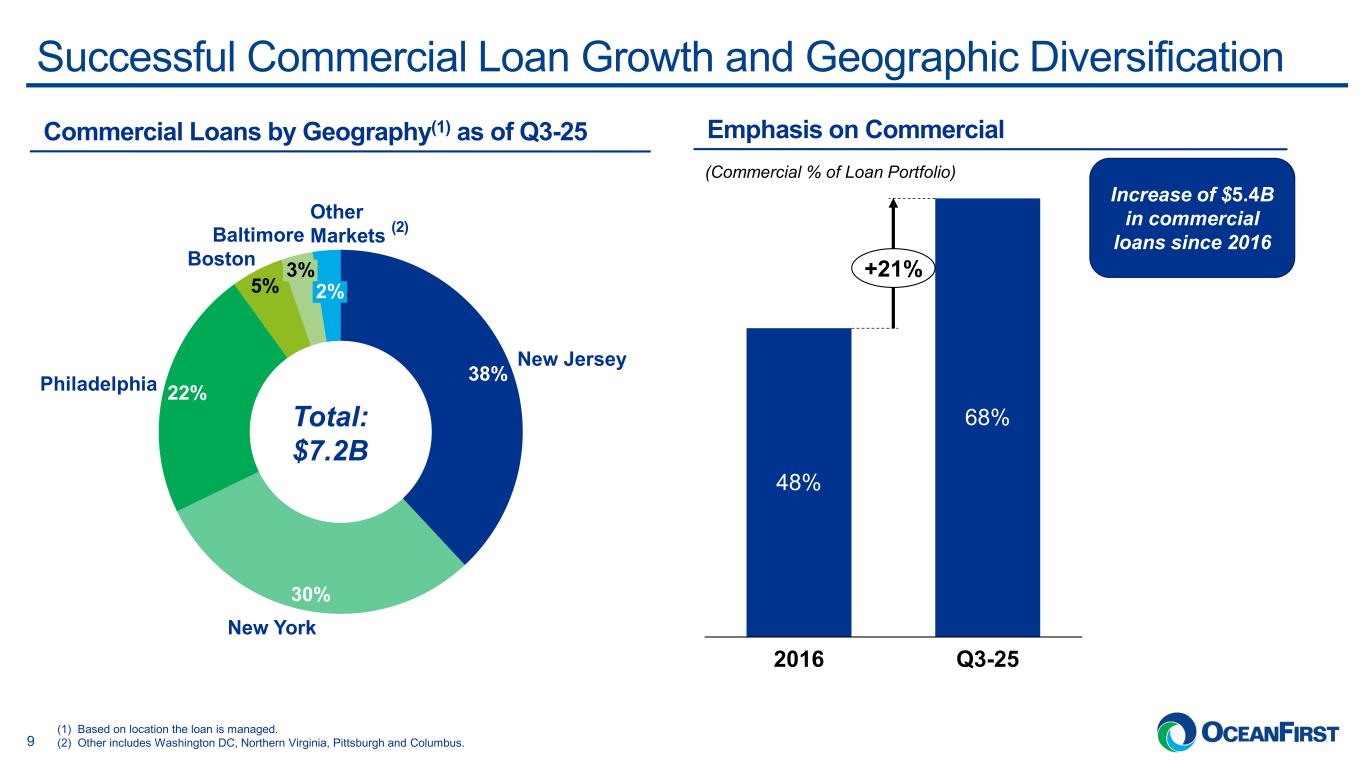 . . . Tailored Footprint Across Key Markets Overview of OceanFirst Corporate Overview & Market Data Ticker OCFC (NASDAQ) HQ Red Bank, NJ Branch Network 40 branches; 9 commercial banking centers Core Markets New Jersey, New York City, Greater Philadelphia Expansion Markets Boston, Northern Virginia, and Baltimore Balance Sheet and Capital (Q1-23) Assets $14.3 billion Net Loans $10.5 billion Deposits $10.4 billion Non-performing Loans / Loans(1) 0.34% Tang. Equity / Tang. Assets(2) 8.1% CET1 Ratio (3) 10.6% Q3-25 Loan Portfolio ($’millions) Q3-25 Deposit Base ($’millions) Core Profitability (Q1-23)2 Net Income $20.3 million EPS $0.36 Net Interest Margin (%)(4) 2.89% Efficiency Ratio (%) 70.3% ROAA (%) 0.60% ROTCE (%) 7.19% Corporate Overview and Market Data Balance Sheet and ital (Q3-25) Core Profitability (Q3-25)(2) $5,211 CRE Investor -Owned $997 C&I - real estate $999 C&I - non-real estate $3,135 Residential $216 Home Eq. & Consumer Note: All data presented is as of September 30, 2025. (1) PCD loans are not included in these metrics. (2) For non-GAAP financial measures, please refer to the “Non-GAAP Reconciliations” in the Appendix for a reconciliation to GAAP financial information. (3) CET1 Ratio – Preliminary Estimate. (4) Core NIM excludes purchase accounting and prepayment fee income. (5) See details on slide 7. $1,732 Non-interest $4,091 Interest-bearing $1,398 Money market $1,000Savings $2,215 Time deposits 4 3 Baltimore and Northern VA Boston Area PA, NJ, NYC 1 2 Commercial Banking Centers Retail Branches Premier Locations 2 3 1 Commercial Banking Centers Retail Branches Premier Locations(5)