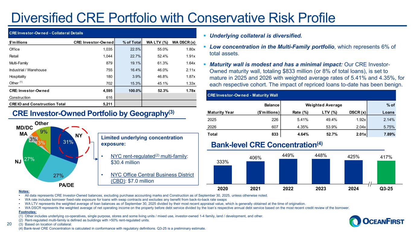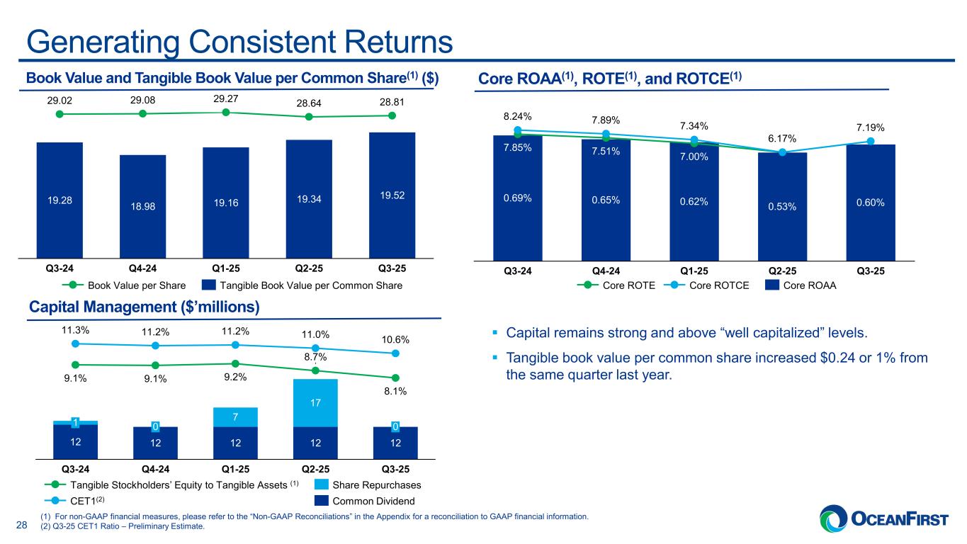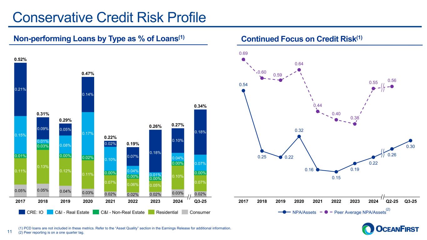 . . .Legal Disclaimer REGISTRATION STATEMENT; NO OFFER OR SOLICITATION. This presentation is neither an offer to sell nor a solicitation of an offer to purchase any securities of OceanFirst Financial Corp. (the “Company”). If the Company were to conduct an offering of securities in the future, such offering would be made under the Company’s automatic shelf registration statement (including a prospectus) filed with the Securities and Exchange Commission and only by means of a prospectus supplement relating to the offering and the accompanying prospectus forming part of that registration statement. In such an event, a copy of the prospectus and the applicable prospectus supplement relating to such offering may be obtained from the Securities and Exchange Commission's website at www.sec.gov, by contacting the Company or the underwriters for such offering. If the Company conducts such an offering, you are advised to obtain a copy of such documents and to carefully review the information contained or incorporated by reference therein before making any investment decision. Certain information contained in this presentation and statements made orally during this presentation relate to or are based on publications and other data obtained from third-party sources. While we believe these third-party sources to be reliable, we have not independently verified, and make no representation as to the adequacy, fairness, accuracy or completeness of, any information obtained from such third-party sources. Except as otherwise indicated, this presentation speaks as of the date hereof. FORWARD LOOKING STATEMENTS. In addition to historical information, this presentation contains certain forward-looking statements within the meaning of the Private Securities Litigation Reform Act of 1995, which are based on certain assumptions and describe future plans, financial results, strategies and expectations of the Company. These forward-looking statements are generally identified by use of the words “believe,” “expect,” “intend,” “anticipate,” “estimate,” “project,” “will,” “should,” “may,” “view,” “opportunity,” “potential,” or similar expressions or expressions of confidence. The Company’s ability to predict results or the actual effect of future plans or strategies is inherently uncertain. Factors which could have a material adverse effect on the operations of the Company and its subsidiaries include, but are not limited to: changes in interest rates, inflation, general economic conditions, including potential recessionary conditions, levels of unemployment in the Company’s lending area, real estate market values in the Company’s lending area, potential goodwill impairment, natural disasters, potential increases to flood insurance premiums, the effects of the federal government shutdown; the current or anticipated impact of military conflict, terrorism or other geopolitical events, the imposition of tariffs or other domestic or international governmental policies and retaliatory responses, the level of prepayments on loans and mortgage-backed securities, legislative/regulatory changes, monetary and fiscal policies of the U.S. Government, including policies of the U.S. Treasury and the Board of Governors of the Federal Reserve System, the quality or composition of the loan or investment portfolios, demand for loan products, deposit flows, the availability of low-cost funding, changes in liquidity, including the size and composition of the Company’s deposit portfolio and the percentage of uninsured deposits in the portfolio, changes in capital management and balance sheet strategies and the ability to successfully implement such strategies, competition, demand for financial services in the Company’s market area, changes in investor sentiment and consumer spending, borrowing and saving habits, changes in accounting principles, a failure in or breach of the Company’s operational or security systems or infrastructure, including cyberattacks, the failure to maintain current technologies, failure to retain or attract employees, the impact of pandemics on our operations and financial results and those of our customers and the Bank’s ability to successfully integrate acquired operations. These risks and uncertainties are further discussed in the Company’s Annual Report on Form 10-K for the year ended December 31, 2024, under Item 1A - Risk Factors and elsewhere, and subsequent securities filings and should be considered in evaluating forward-looking statements and undue reliance should not be placed on such statements. The Company does not undertake, and specifically disclaims any obligation, to publicly release the result of any revisions which may be made to any forward-looking statements to reflect events or circumstances after the date of such statements or to reflect the occurrence of anticipated or unanticipated events. 2