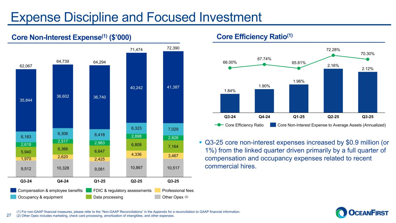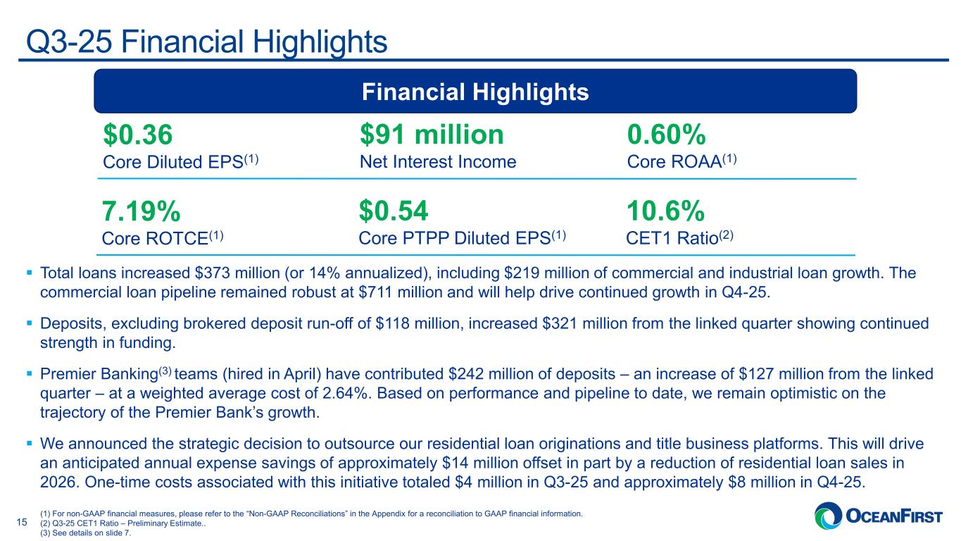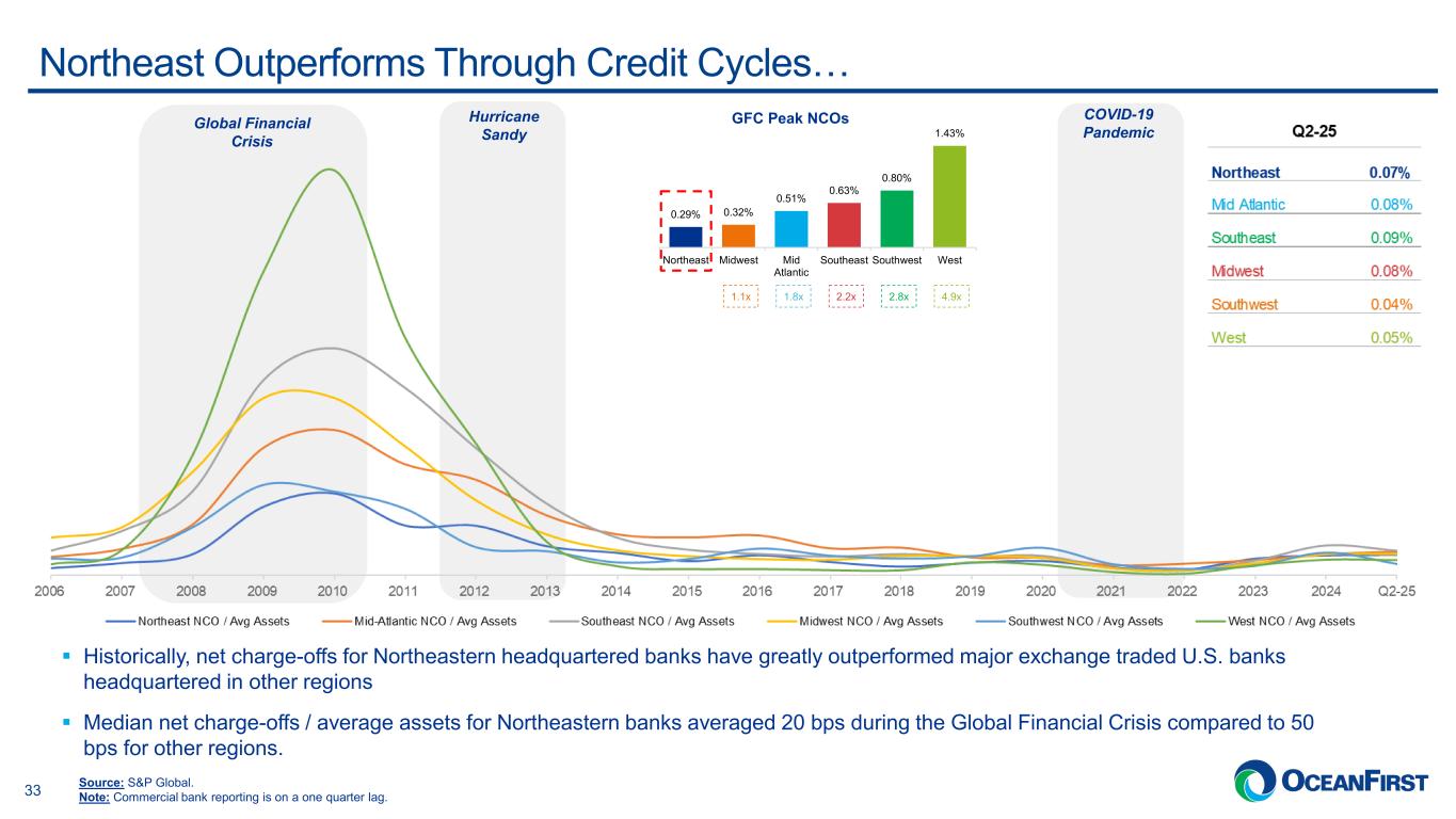 . . .Legal Disclaimer REGISTRATION STATEMENT; NO OFFER OR SOLICITATION. This presentation is neither an offer to sell nor a solicitation of an offer to purchase any securities of OceanFirst Financial Corp. (the “Company”). If the Company were to conduct an offering of securities in the future, such offering would be made under the Company’s automatic shelf registration statement (including a prospectus) filed with the Securities and Exchange Commission and only by means of a prospectus supplement relating to the offering and the accompanying prospectus forming part of that registration statement. In such an event, a copy of the prospectus and the applicable prospectus supplement relating to such offering may be obtained from the Securities and Exchange Commission's website at www.sec.gov, by contacting the Company or the underwriters for such offering. If the Company conducts such an offering, you are advised to obtain a copy of such documents and to carefully review the information contained or incorporated by reference therein before making any investment decision. Certain information contained in this presentation and statements made orally during this presentation relate to or are based on publications and other data obtained from third-party sources. While we believe these third-party sources to be reliable, we have not independently verified, and make no representation as to the adequacy, fairness, accuracy or completeness of, any information obtained from such third-party sources. Except as otherwise indicated, this presentation speaks as of the date hereof. FORWARD LOOKING STATEMENTS. In addition to historical information, this presentation contains certain forward-looking statements within the meaning of the Private Securities Litigation Reform Act of 1995, which are based on certain assumptions and describe future plans, financial results, strategies and expectations of the Company. These forward-looking statements are generally identified by use of the words “believe,” “expect,” “intend,” “anticipate,” “estimate,” “project,” “will,” “should,” “may,” “view,” “opportunity,” “potential,” or similar expressions or expressions of confidence. The Company’s ability to predict results or the actual effect of future plans or strategies is inherently uncertain. Factors which could have a material adverse effect on the operations of the Company and its subsidiaries include, but are not limited to: changes in interest rates, inflation, general economic conditions, including potential recessionary conditions, levels of unemployment in the Company’s lending area, real estate market values in the Company’s lending area, potential goodwill impairment, natural disasters, potential increases to flood insurance premiums, the effects of the federal government shutdown; the current or anticipated impact of military conflict, terrorism or other geopolitical events, the imposition of tariffs or other domestic or international governmental policies and retaliatory responses, the level of prepayments on loans and mortgage-backed securities, legislative/regulatory changes, monetary and fiscal policies of the U.S. Government, including policies of the U.S. Treasury and the Board of Governors of the Federal Reserve System, the quality or composition of the loan or investment portfolios, demand for loan products, deposit flows, the availability of low-cost funding, changes in liquidity, including the size and composition of the Company’s deposit portfolio and the percentage of uninsured deposits in the portfolio, changes in capital management and balance sheet strategies and the ability to successfully implement such strategies, competition, demand for financial services in the Company’s market area, changes in investor sentiment and consumer spending, borrowing and saving habits, changes in accounting principles, a failure in or breach of the Company’s operational or security systems or infrastructure, including cyberattacks, the failure to maintain current technologies, failure to retain or attract employees, the impact of pandemics on our operations and financial results and those of our customers and the Bank’s ability to successfully integrate acquired operations. These risks and uncertainties are further discussed in the Company’s Annual Report on Form 10-K for the year ended December 31, 2024, under Item 1A - Risk Factors and elsewhere, and subsequent securities filings and should be considered in evaluating forward-looking statements and undue reliance should not be placed on such statements. The Company does not undertake, and specifically disclaims any obligation, to publicly release the result of any revisions which may be made to any forward-looking statements to reflect events or circumstances after the date of such statements or to reflect the occurrence of anticipated or unanticipated events. 2