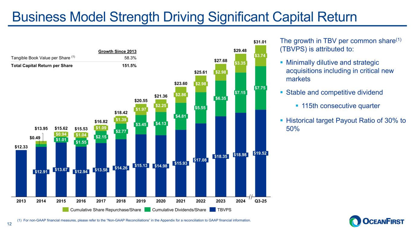. . .Business Model Strength Driving Significant Capital Return $12.33 $0.49 $0.55 $1.01 $13.67 2015 $1.04 $1.55 $12.94 2016 $1.09 $2.15 $13.58 2017 $1.39 $2.77 $14.26 2018 $1.97 $3.45 $15.13 2019 $2.25 $4.13 $14.98 2020 $2.86 $4.81 $15.93 2021 $2.98 $5.55 $17.08 2022 $2.98 $6.35 $18.35 2023 $3.35 $7.15 $18.98 2024 $3.74 $7.75 $19.52 2013 $13.95 $15.62 $15.53 $16.82 $18.42 $20.55 $21.36 Q3-25 $25.61 $27.68 $29.48 $31.01 $12.91 2014 $0.94 $23.60 The growth in TBV per common share(1) (TBVPS) is attributed to: Minimally dilutive and strategic acquisitions including in critical new markets Stable and competitive dividend 115th consecutive quarter Historical target Payout Ratio of 30% to 50% (1) For non-GAAP financial measures, please refer to the “Non-GAAP Reconciliations” in the Appendix for a reconciliation to GAAP financial information. Growth Since 2013 Tangible Book Value per Share (1) 58.3% Total Capital Return per Share 151.5% Cumulative Share Repurchase/Share Cumulative Dividends/Share TBVPS 12