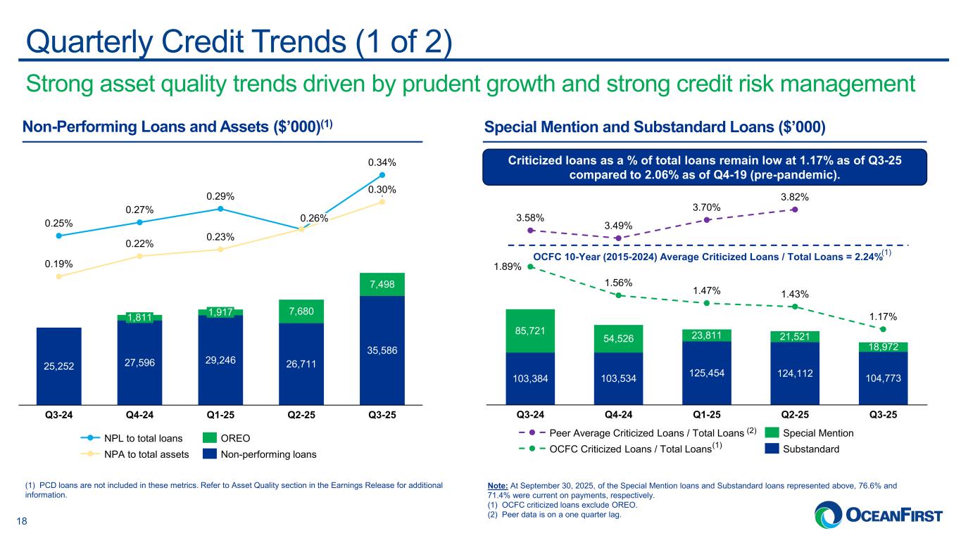 . . . COVID-19 Pandemic Track Record of Strong Credit Performance From 2006 to Q3-25, inclusive of the Global Financial Crisis, Hurricane Sandy, and the COVID-19 Pandemic, OCFC’s NCO to average loans totaled 13 bps per year compared to 71 bps for all commercial banks between $10 - $50 billion in assets. From 2006 to Q3-25, peak net charge-offs to average loans for OCFC totaled 56 bps in 2011. Peak charge-offs for commercial banks between $10 - $50 billion in assets were 253 bps in 2009. Global Financial Crisis Hurricane Sandy 2006 2007 2008 2009 2010 2011 2012 2013 2014 2015 2016 2017 2018 2019 2020 2021 2022 2023 2024 Q2-25 Q3-25 OCFC NCO / Avg Loans Commercial Banks ($10-50 bn) NCO / Avg Loans (1) 17 Source: S&P Global. Note: Commercial bank reporting is on a one quarter lag. (1) Any period with net recoveries is denoted as 0% NCO / Avg Loans in the graph.