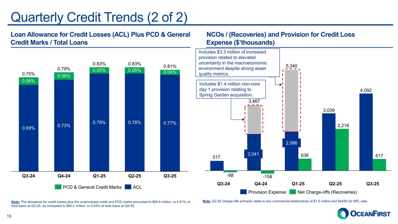 . . . 103,384 103,534 125,454 124,112 104,773 85,721 54,526 23,811 21,521 18,972 3.58% 1.89% Q3-24 3.49% 1.56% Q4-24 3.70% 1.47% Q1-25 3.82% 1.43% Q2-25 1.17% Q3-25 Strong asset quality trends driven by prudent growth and strong credit risk management Quarterly Credit Trends (1 of 2) Note: At September 30, 2025, of the Special Mention loans and Substandard loans represented above, 76.6% and 71.4% were current on payments, respectively. (1) OCFC criticized loans exclude OREO. (2) Peer data is on a one quarter lag. Non-Performing Loans and Assets ($’000)(1) Special Mention and Substandard Loans ($’000) (1) PCD loans are not included in these metrics. Refer to Asset Quality section in the Earnings Release for additional information. Criticized loans as a % of total loans remain low at 1.17% as of Q3-25 compared to 2.06% as of Q4-19 (pre-pandemic). 0.20% 25,252 27,596 29,246 26,711 35,586 7,680 7,498 0.25% 0.19% Q3-24 0.27% 0.22% 1,811 Q4-24 0.29% 0.23% 1,917 Q1-25 0.26% Q2-25 0.34% 0.30% Q3-25 NPL to total loans NPA to total assets OREO Non-performing loans Peer Average Criticized Loans / Total Loans OCFC Criticized Loans / Total Loans Special Mention Substandard 18 OCFC 10-Year (2015-2024) Average Criticized Loans / Total Loans = 2.24% (2) (1) (1)