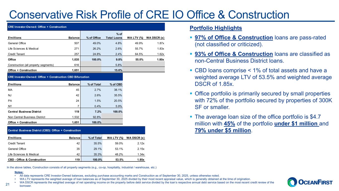 . . .Diversified CRE Portfolio with Conservative Risk Profile Underlying collateral is diversified. Low concentration in the Multi-Family portfolio, which represents 6% of total assets. Maturity wall is modest and has a minimal impact: Our CRE Investor- Owned maturity wall, totaling $833 million (or 8% of total loans), is set to mature in 2025 and 2026 with weighted average rates of 5.41% and 4.35%, for each respective cohort. The impact of repriced loans to-date has been benign. CRE Investor-Owned Portfolio by Geography(3) Notes: • All data represents CRE Investor-Owned balances, excluding purchase accounting marks and Construction as of September 30, 2025, unless otherwise noted. • WA rate includes borrower fixed-rate exposure for loans with swap contracts and excludes any benefit from back-to-back rate swaps • WA LTV represents the weighted average of loan balances as of September 30, 2025 divided by their most recent appraisal value, which is generally obtained at the time of origination. • WA DSCR represents the weighted average of net operating income on the property before debt service divided by the loan’s respective annual debt service based on the most recent credit review of the borrower. Footnotes: (1) Other includes underlying co-operatives, single purpose, stores and some living units / mixed use, investor-owned 1-4 family, land / development, and other. (2) Rent-regulated multi-family is defined as buildings with >50% rent-regulated units. (3) Based on location of collateral. (4) Bank-level CRE Concentration is calculated in conformance with regulatory definitions. Q3-25 is a preliminary estimate. 31% 27% 27% 9% NY PA/DE NJ 3% MA 3% MD/DC Other Limited underlying concentration exposure: • NYC rent-regulated(2) multi-family: $30.4 million • NYC Office Central Business District (CBD): $7.0 million 20 Bank-level CRE Concentration(4) 2020 2021 2022 2023 2024 Q3-25 333% 406% 449% 448% 425% 417% CRE Investor-Owned - Collateral Details $'millions CRE: Investor-Owned % of Total WA LTV (%) WA DSCR (x) Office 1,035 22.5% 55.0% 1.80x Retail 1,044 22.7% 52.4% 1.91x Multi-Family 879 19.1% 61.3% 1.64x Industrial / Warehouse 755 16.4% 46.0% 2.11x Hospitality 180 3.9% 46.8% 1.87x Other (1) 702 15.3% 45.1% 1.33x CRE: Investor-Owned 4,595 100.0% 52.3% 1.78x Construction 616 CRE IO and Construction Total 5,211 CRE Investor-Owned - Maturity Wall Balance Weighted Average % of Maturity Year ($'millions) Rate (%) LTV (%) DSCR (x) Loans 2025 226 5.41% 49.4% 1.92x 2.14% 2026 607 4.35% 53.9% 2.04x 5.75% Total 833 4.64% 52.7% 2.01x 7.89%