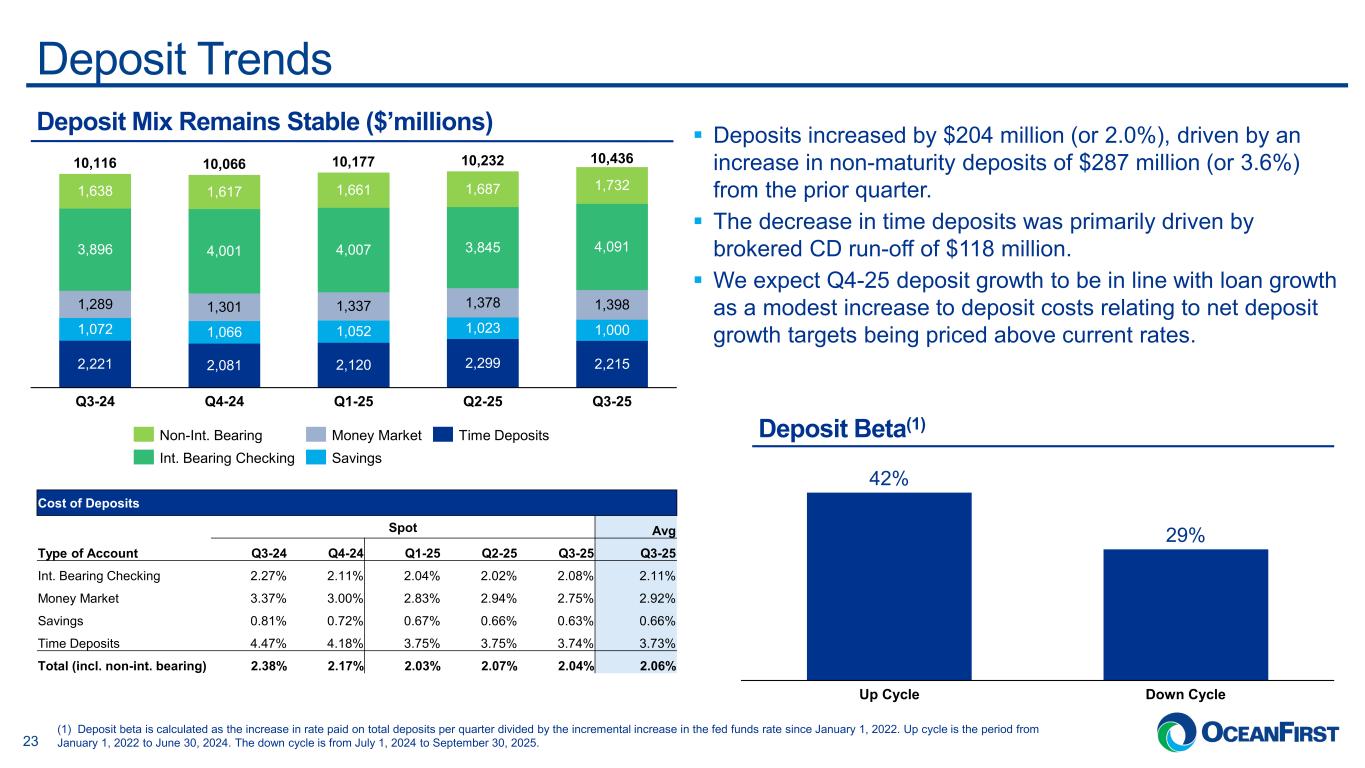 . . .Deposit Trends Deposits increased by $204 million (or 2.0%), driven by an increase in non-maturity deposits of $287 million (or 3.6%) from the prior quarter. The decrease in time deposits was primarily driven by brokered CD run-off of $118 million. We expect Q4-25 deposit growth to be in line with loan growth as a modest increase to deposit costs relating to net deposit growth targets being priced above current rates. Deposit Mix Remains Stable ($’millions) 2,221 2,081 2,120 2,299 2,215 1,072 1,066 1,052 1,023 1,000 1,289 1,301 1,337 1,378 1,398 3,896 4,001 4,007 3,845 4,091 1,638 1,617 1,661 1,687 1,732 Q3-24 Q4-24 Q1-25 Q2-25 Q3-25 10,116 10,066 10,177 10,232 10,436 Non-Int. Bearing Int. Bearing Checking Money Market Savings Time Deposits Deposit Beta(1) 23 Cost of Deposits Spot Avg Type of Account Q3-24 Q4-24 Q1-25 Q2-25 Q3-25 Q3-25 Int. Bearing Checking 2.27% 2.11% 2.04% 2.02% 2.08% 2.11% Money Market 3.37% 3.00% 2.83% 2.94% 2.75% 2.92% Savings 0.81% 0.72% 0.67% 0.66% 0.63% 0.66% Time Deposits 4.47% 4.18% 3.75% 3.75% 3.74% 3.73% Total (incl. non-int. bearing) 2.38% 2.17% 2.03% 2.07% 2.04% 2.06% (1) Deposit beta is calculated as the increase in rate paid on total deposits per quarter divided by the incremental increase in the fed funds rate since January 1, 2022. Up cycle is the period from January 1, 2022 to June 30, 2024. The down cycle is from July 1, 2024 to September 30, 2025. Up Cycle Down Cycle 42% 29%