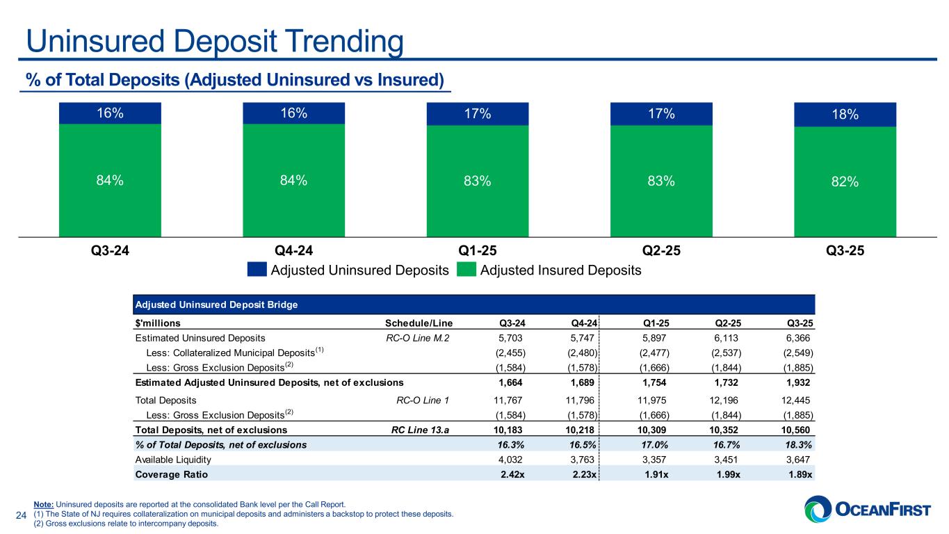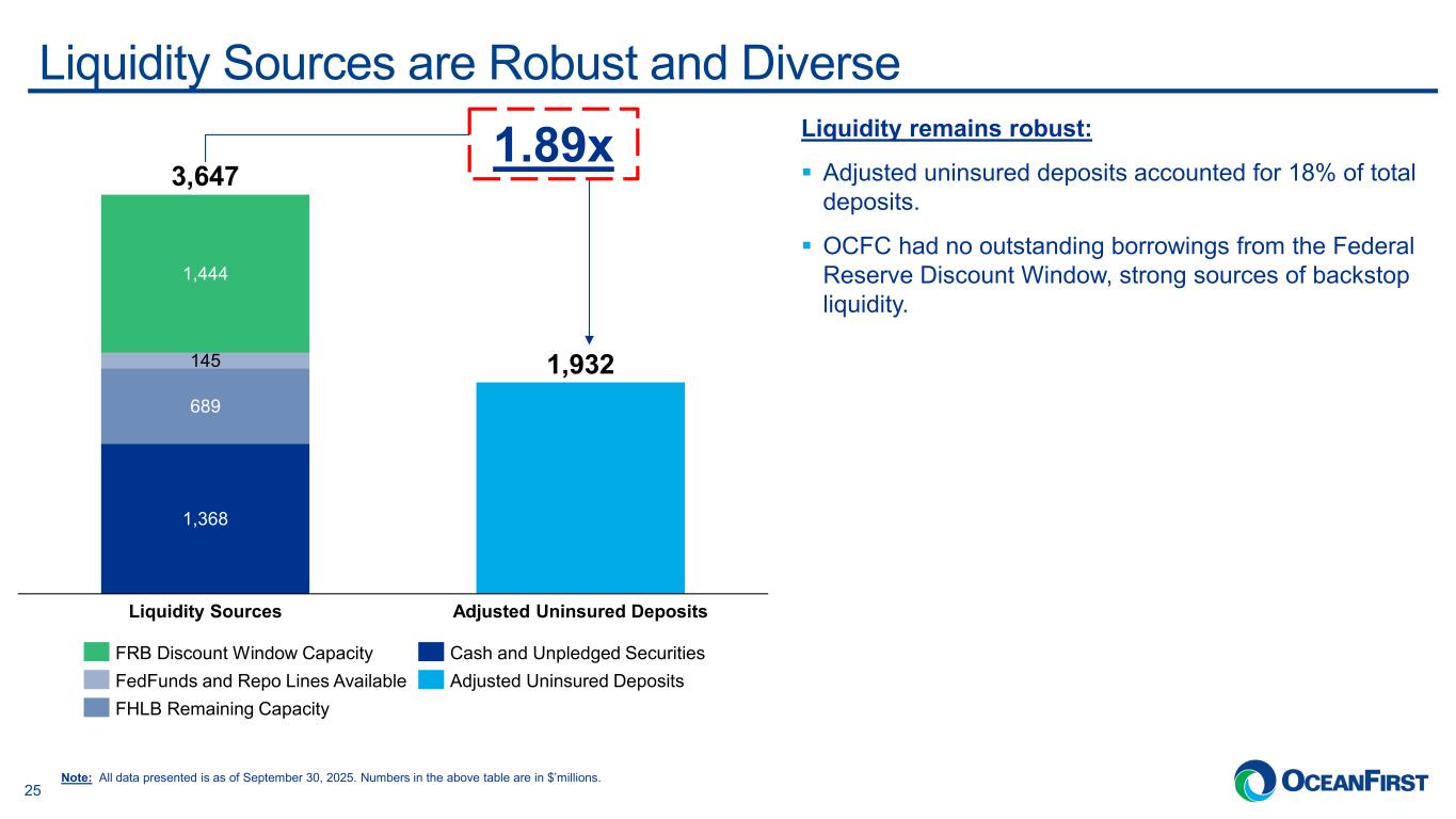 . . .Uninsured Deposit Trending 16% 84% Q3-24 16% 84% Q4-24 17% 83% Q1-25 17% 83% Q2-25 18% 82% Q3-25 Adjusted Uninsured Deposits Adjusted Insured Deposits % of Total Deposits (Adjusted Uninsured vs Insured) Note: Uninsured deposits are reported at the consolidated Bank level per the Call Report. (1) The State of NJ requires collateralization on municipal deposits and administers a backstop to protect these deposits. (2) Gross exclusions relate to intercompany deposits. 24 Adjusted Uninsured Deposit Bridge $'millions Schedule/Line Q3-24 Q4-24 Q1-25 Q2-25 Q3-25 Estimated Uninsured Deposits RC-O Line M.2 5,703 5,747 5,897 6,113 6,366 Less: Collateralized Municipal Deposits(1) (2,455) (2,480) (2,477) (2,537) (2,549) Less: Gross Exclusion Deposits(2) (1,584) (1,578) (1,666) (1,844) (1,885) Estimated Adjusted Uninsured Deposits, net of exclusions 1,664 1,689 1,754 1,732 1,932 Total Deposits RC-O Line 1 11,767 11,796 11,975 12,196 12,445 Less: Gross Exclusion Deposits(2) (1,584) (1,578) (1,666) (1,844) (1,885) Total Deposits, net of exclusions RC Line 13.a 10,183 10,218 10,309 10,352 10,560 % of Total Deposits, net of exclusions 16.3% 16.5% 17.0% 16.7% 18.3% Available Liquidity 4,032 3,763 3,357 3,451 3,647 Coverage Ratio 2.42x 2.23x 1.91x 1.99x 1.89x