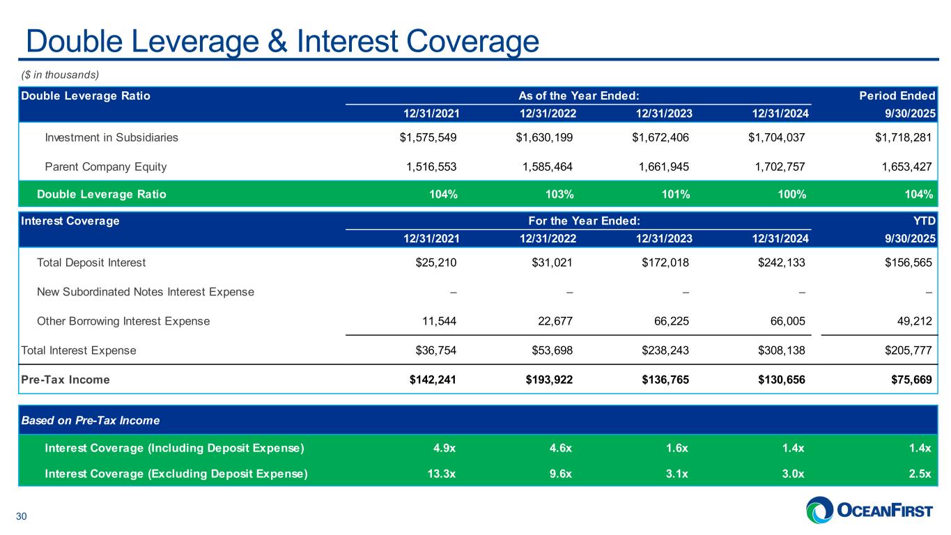 . . .Double Leverage & Interest Coverage 30 ($ in thousands) Double Leverage Ratio As of the Year Ended: Period Ended 12/31/2021 12/31/2022 12/31/2023 12/31/2024 9/30/2025 Investment in Subsidiaries $1,575,549 $1,630,199 $1,672,406 $1,704,037 $1,718,281 Parent Company Equity 1,516,553 1,585,464 1,661,945 1,702,757 1,653,427 Double Leverage Ratio 104% 103% 101% 100% 104% Interest Coverage For the Year Ended: YTD 12/31/2021 12/31/2022 12/31/2023 12/31/2024 9/30/2025 Total Deposit Interest $25,210 $31,021 $172,018 $242,133 $156,565 New Subordinated Notes Interest Expense – – – – – Other Borrowing Interest Expense 11,544 22,677 66,225 66,005 49,212 Total Interest Expense $36,754 $53,698 $238,243 $308,138 $205,777 Pre-Tax Income $142,241 $193,922 $136,765 $130,656 $75,669 Based on Pre-Tax Income Interest Coverage (Including Deposit Expense) 4.9x 4.6x 1.6x 1.4x 1.4x Interest Coverage (Excluding Deposit Expense) 13.3x 9.6x 3.1x 3.0x 2.5x