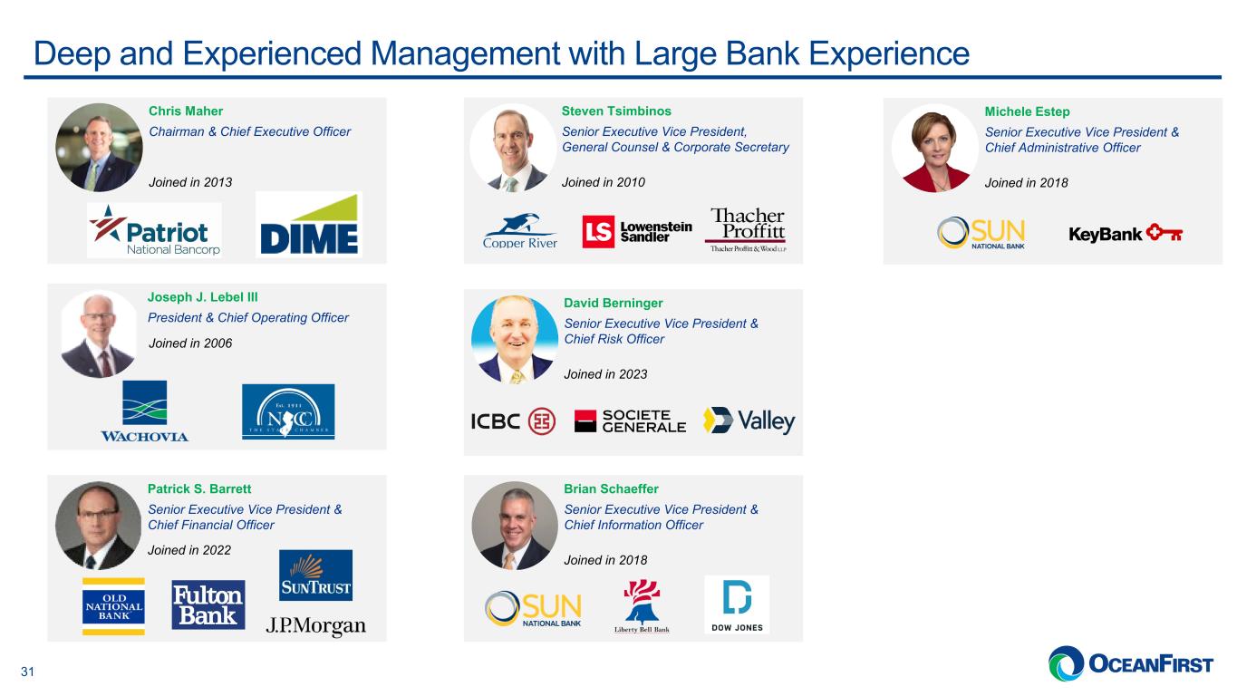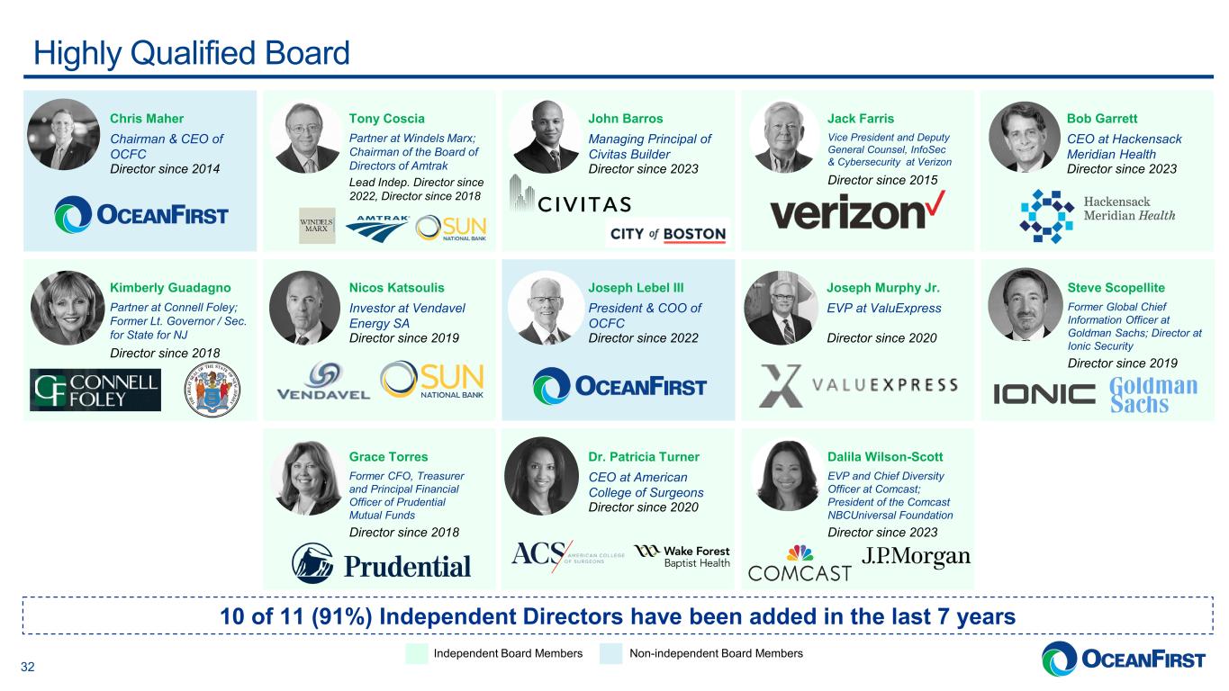 . . .Deep and Experienced Management with Large Bank Experience Steven Tsimbinos Senior Executive Vice President, General Counsel & Corporate Secretary Joined in 2010 Michele Estep Senior Executive Vice President & Chief Administrative Officer Joined in 2018 David Berninger Senior Executive Vice President & Chief Risk Officer Joined in 2023 Brian Schaeffer Senior Executive Vice President & Chief Information Officer Joined in 2018 Chris Maher Chairman & Chief Executive Officer Joined in 2013 Joseph J. Lebel III President & Chief Operating Officer Joined in 2006 Patrick S. Barrett Senior Executive Vice President & Chief Financial Officer Joined in 2022 31