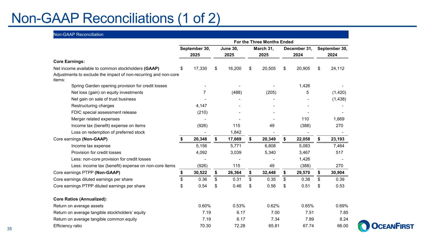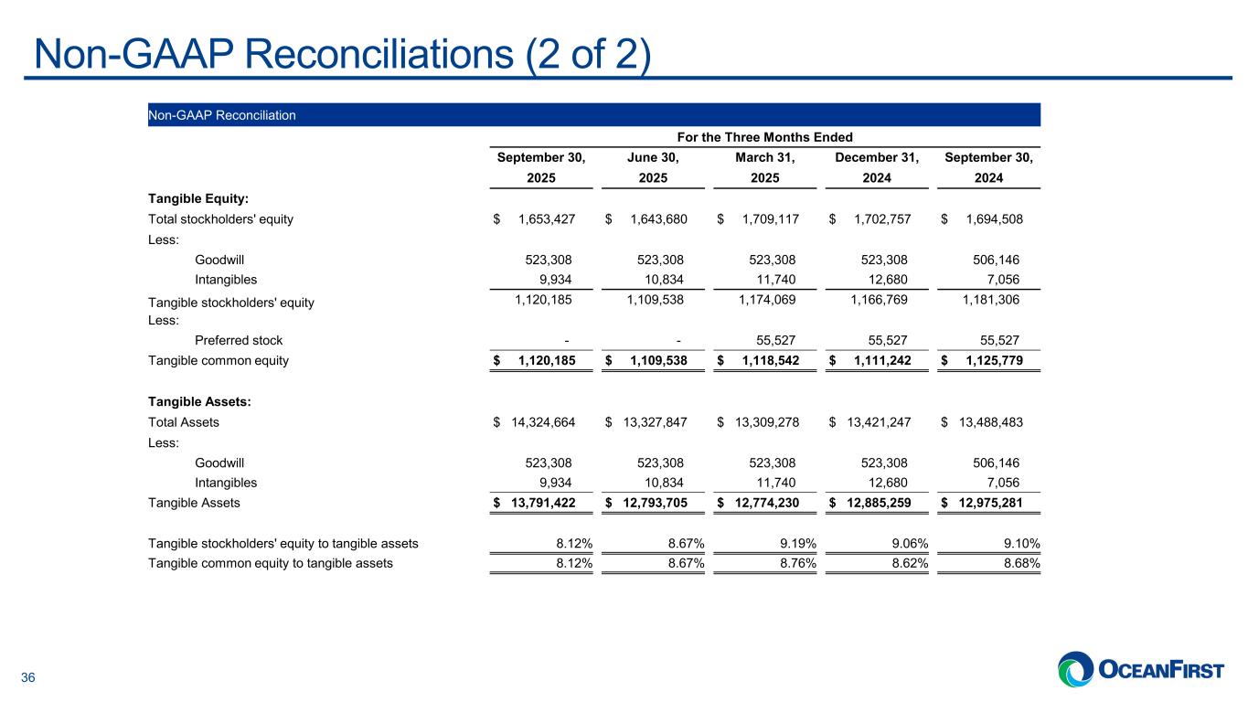 . . .Non-GAAP Reconciliations (1 of 2) 35 Non-GAAP Reconciliation For the Three Months Ended September 30, June 30, March 31, December 31, September 30, 2025 2025 2025 2024 2024 Core Earnings: Net income available to common stockholders (GAAP) $ 17,330 $ 16,200 $ 20,505 $ 20,905 $ 24,112 Adjustments to exclude the impact of non-recurring and non-core items: Spring Garden opening provision for credit losses - - - 1,426 - Net loss (gain) on equity investments 7 (488) (205) 5 (1,420) Net gain on sale of trust business - - - - (1,438) Restructuring charges 4,147 - - - - FDIC special assessment release (210) - - - - Merger related expenses - - - 110 1,669 Income tax (benefit) expense on items (926) 115 49 (388) 270 Loss on redemption of preferred stock - 1,842 - - - Core earnings (Non-GAAP) $ 20,348 $ 17,669 $ 20,349 $ 22,058 $ 23,193 Income tax expense 5,156 5,771 6,808 5,083 7,464 Provision for credit losses 4,092 3,039 5,340 3,467 517 Less: non-core provision for credit losses - - - 1,426 - Less: income tax (benefit) expense on non-core items (926) 115 49 (388) 270 Core earnings PTPP (Non-GAAP) $ 30,522 $ 26,364 $ 32,448 $ 29,570 $ 30,904 Core earnings diluted earnings per share $ 0.36 $ 0.31 $ 0.35 $ 0.38 $ 0.39 Core earnings PTPP diluted earnings per share $ 0.54 $ 0.46 $ 0.56 $ 0.51 $ 0.53 Core Ratios (Annualized): Return on average assets 0.60% 0.53% 0.62% 0.65% 0.69% Return on average tangible stockholders’ equity 7.19 6.17 7.00 7.51 7.85 Return on average tangible common equity 7.19 6.17 7.34 7.89 8.24 Efficiency ratio 70.30 72.28 65.81 67.74 66.00