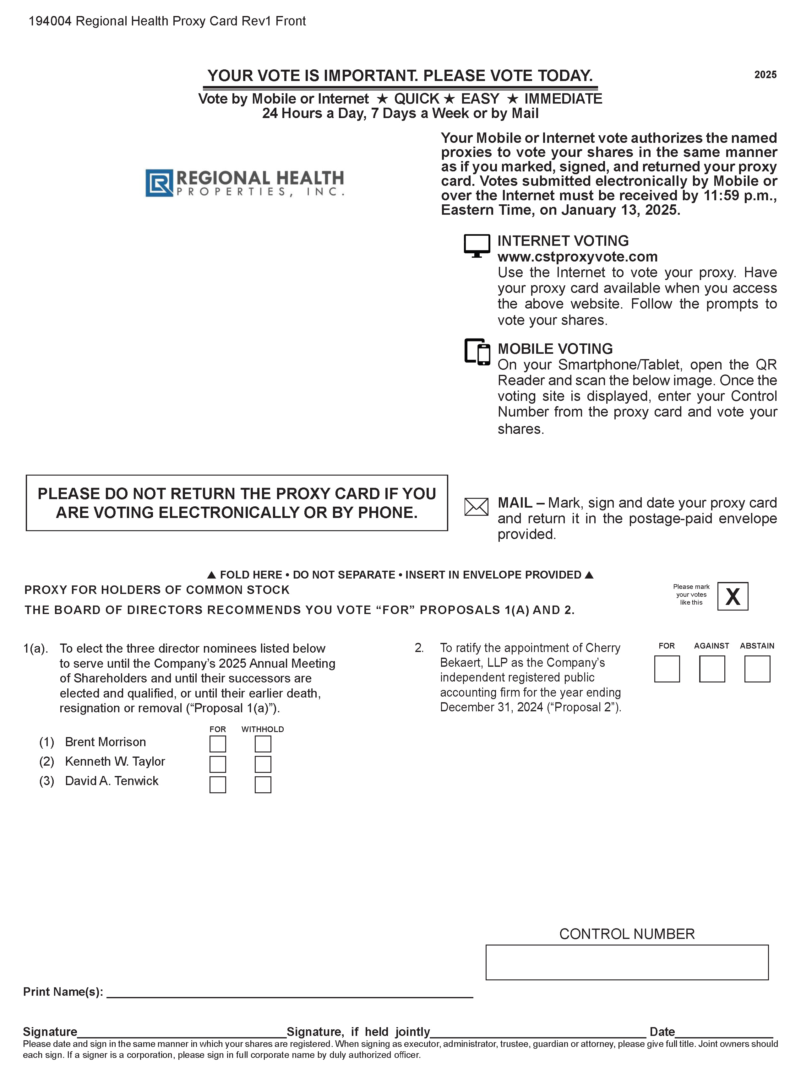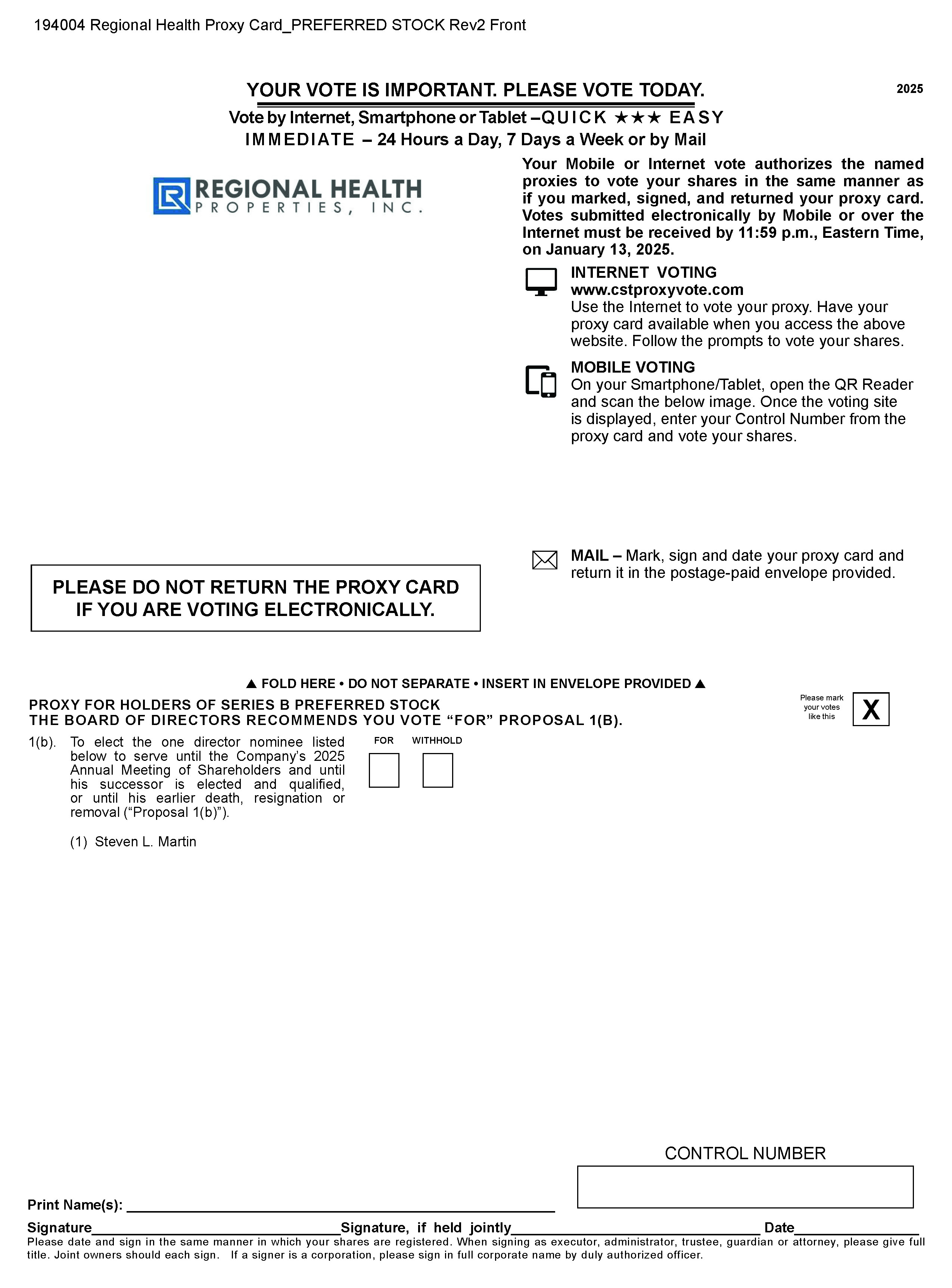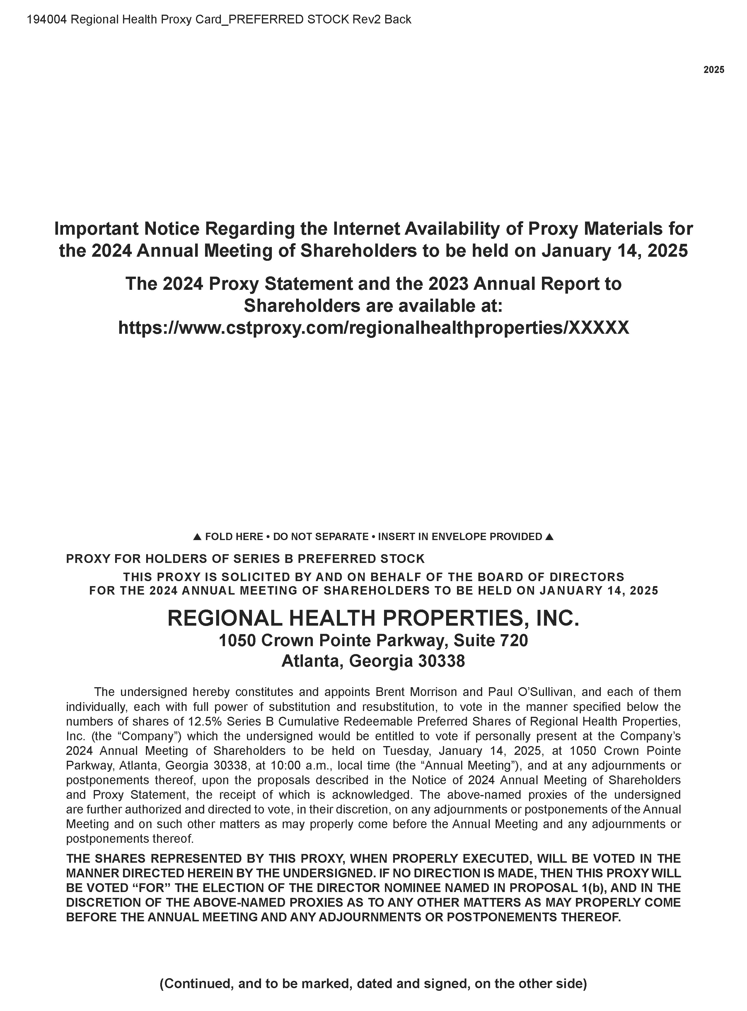 Important Notice Regarding the Availability of Proxy Materials for the 2024 Annual Meeting of Shareholders to be Held on Tuesday, December 31, 2024: Our 2024 proxy materials and Annual Report on Form 10-K for the fiscal year ended December 31, 2023 are available free of charge at https://www.cstproxy.com/regionalhealthproperties/2024.