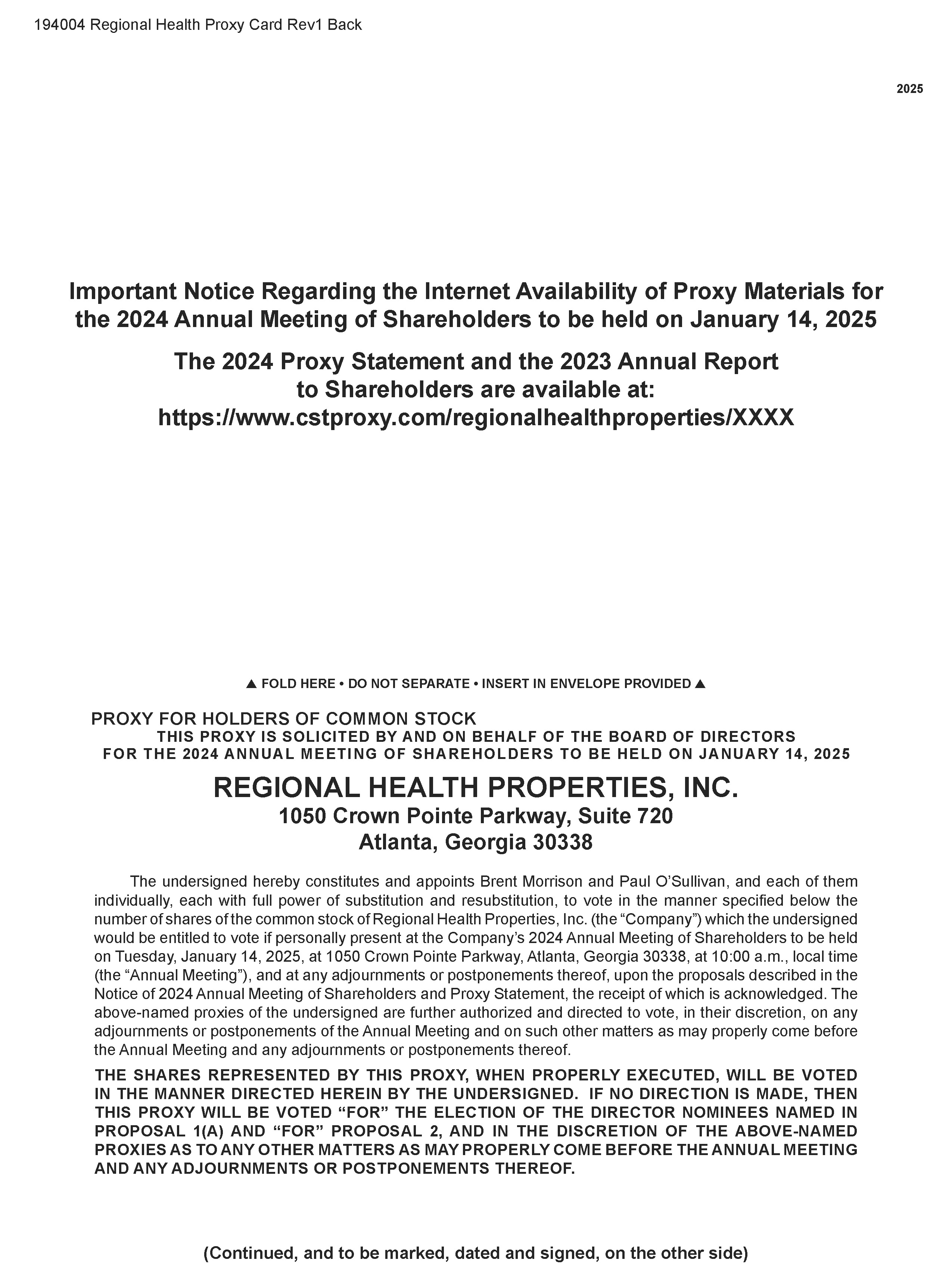It is my pleasure to invite you to attend the 2024 Annual Meeting of Shareholders (the “Annual Meeting”) of Regional Health Properties, Inc., which will be held on Tuesday, January 14, 2025, at 1050 Crown Pointe Parkway, Atlanta, Georgia 30338, at 10:00 a.m., local time. We look forward to personally seeing as many of our shareholders as possible.