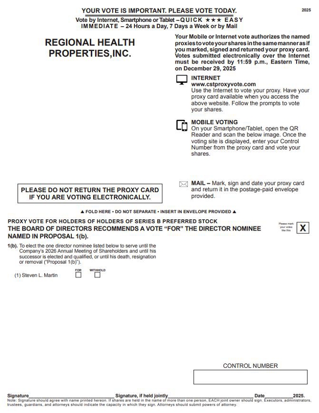 YOUR VOTE IS IMPORTANT. PLEASE VOTE TODAY. Vote by Internet, Smartphone or Tablet -QUICK ??? EASY IMMEDIATE - 24 Hours a Day, 7 Days a Week or by Mail REGIONAL HEALTH PROPERTIES,INC. Your Mobile or Internet vote authorizes the named proxies to vote your shares in the same manner as if you marked, signed and returned your proxy card. Votes submitted electronically over the Internetmust be received by 11:59 p.m., Eastern Time, on December 29, 2025 INTERNET www.cstproxyvote.com Use the Internet to vote your proxy. Have your proxy card available when you access the above website. Follow the prompts to vote your shares. MOBILE VOTING On your Smartphone/Tablet, open the QR Reader and scan the below image. Once the voting site is displayed, enter your Control Number from the proxy card and vote your shares. MAIL – Mark, sign and date your proxy card PLEASE DO NOT RETURN THE PROXY CARD and return it in the postage-paid envelope provided. IF YOU ARE VOTING ELECTRONICALLY. ? FOLD HERE • DO NOT SEPARATE • INSERT IN ENVELOPE PROVIDED ? PROXY VOTE FOR HOLDERS OF HOLDERS OF SERIES B PREFERRED STOCK Please mark your votes like this THE BOARD OF DIRECTORS RECOMMENDS A VOTE “FOR” THE DIRECTOR NOMINEE X NAMED IN PROPOSAL 1(b). 1(b). To elect the one director nominee listed below to serve until the Company’s 2026 Annual Meeting of Shareholders and until his successor is elected and qualified, or until his death, resignation or removal (“Proposal 1(b)”). FOR WITHHOLD (1) Steven L. Martin CONTROL NUMBER Signature_________________________________ Signature, if held jointly_________________________________ Date___________2025. Note: Signature should agree with name printed hereon. If shares are held in the name of more than one person, EACH joint owner should sign. Executors, administrators, trustees, guardians, and attorneys should indicate the capacity in which they sign. Attorneys should submit powers of attorney.