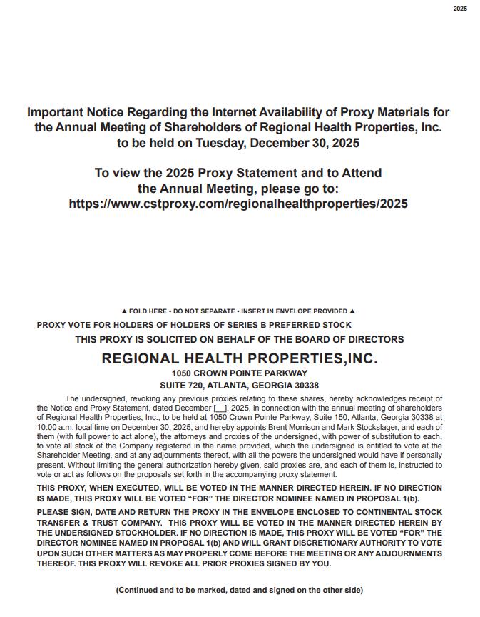 Important Notice Regarding the Internet Availability of Proxy Materials for the Annual Meeting of Shareholders of Regional Health Properties, Inc. to be held on Tuesday, December 30, 2025 To view the 2025 Proxy Statement and to Attend the Annual Meeting, please go to: https://www.cstproxy.com/regionalhealthproperties/2025 ? FOLD HERE • DO NOT SEPARATE • INSERT IN ENVELOPE PROVIDED ? PROXY VOTE FOR HOLDERS OF HOLDERS OF SERIES B PREFERRED STOCK THIS PROXY IS SOLICITED ON BEHALF OF THE BOARD OF DIRECTORS REGIONAL HEALTH PROPERTIES,INC. 1050 CROWN POINTE PARKWAY SUITE 720, ATLANTA, GEORGIA 30338 The undersigned, revoking any previous proxies relating to these shares, hereby acknowledges receipt of the Notice and Proxy Statement, dated December [__], 2025, in connection with the annual meeting of shareholders of Regional Health Properties, Inc., to be held at 1050 Crown Pointe Parkway, Suite 150, Atlanta, Georgia 30338 at 10:00 a.m. local time on December 30, 2025, and hereby appoints Brent Morrison and Mark Stockslager, and each of them (with full power to act alone), the attorneys and proxies of the undersigned, with power of substitution to each, to vote all stock of the Company registered in the name provided, which the undersigned is entitled to vote at the Shareholder Meeting, and at any adjournments thereof, with all the powers the undersigned would have if personally present. Without limiting the general authorization hereby given, said proxies are, and each of them is, instructed to vote or act as follows on the proposals set forth in the accompanying proxy statement. THIS PROXY, WHEN EXECUTED, WILL BE VOTED IN THE MANNER DIRECTED HEREIN. IF NO DIRECTION IS MADE, THIS PROXY WILL BE VOTED “FOR” THE DIRECTOR NOMINEE NAMED IN PROPOSAL 1(b). PLEASE SIGN, DATE AND RETURN THE PROXY IN THE ENVELOPE ENCLOSED TO CONTINENTAL STOCK TRANSFER & TRUST COMPANY. THIS PROXY WILL BE VOTED IN THE MANNER DIRECTED HEREIN BY THE UNDERSIGNED STOCKHOLDER. IF NO DIRECTION IS MADE, THIS PROXY WILL BE VOTED “FOR” THE DIRECTOR NOMINEE NAMED IN PROPOSAL 1(b) AND WILL GRANT DISCRETIONARY AUTHORITY TO VOTE UPON SUCH OTHER MATTERS AS MAY PROPERLY COME BEFORE THE MEETING OR ANY ADJOURNMENTS THEREOF. THIS PROXY WILL REVOKE ALL PRIOR PROXIES SIGNED BY YOU. (Continued and to be marked, dated and signed on the other side)