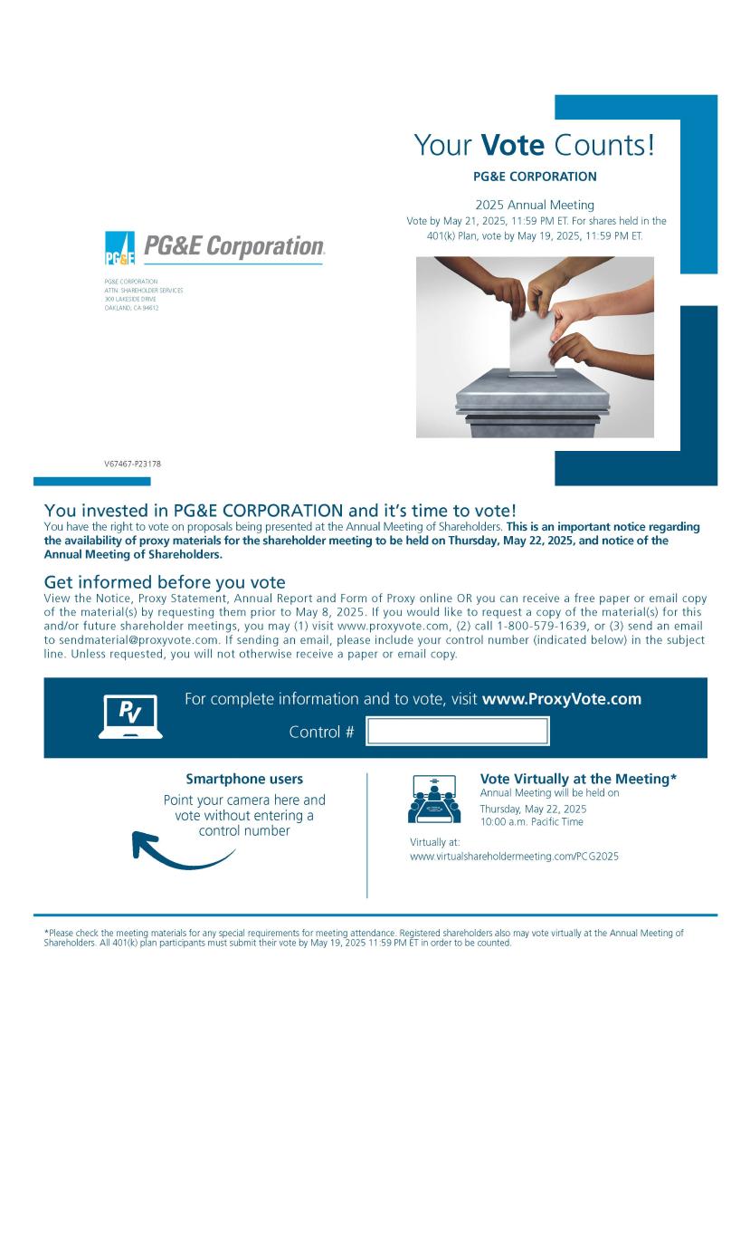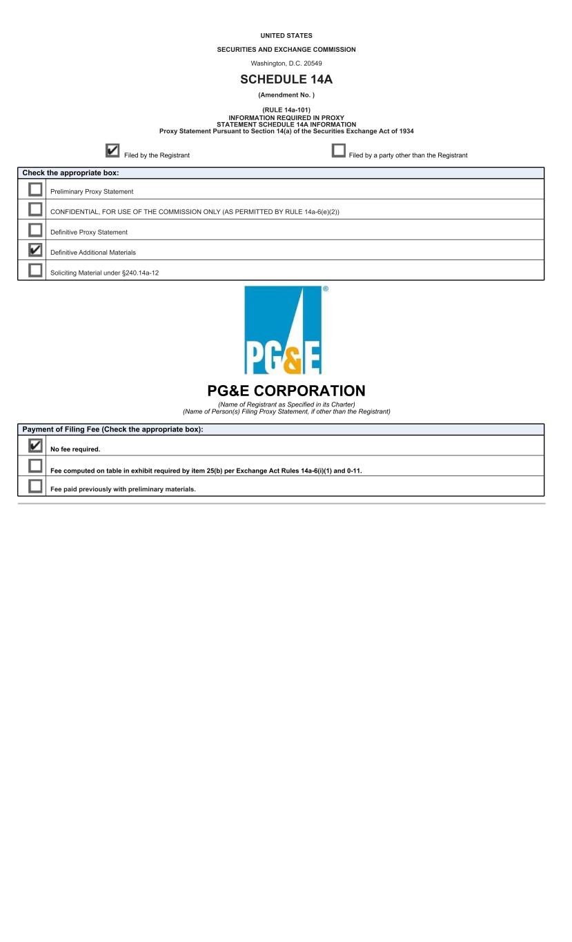 UNITED STATES SECURITIES AND EXCHANGE COMMISSION Washington, D.C. 20549 SCHEDULE 14A (Amendment No. ) (RULE 14a-101) INFORMATION REQUIRED IN PROXY STATEMENT SCHEDULE 14A INFORMATION Proxy Statement Pursuant to Section 14(a) of the Securities Exchange Act of 1934 Filed by the Registrant Filed by a party other than the Registrant Check the appropriate box: Preliminary Proxy Statement CONFIDENTIAL, FOR USE OF THE COMMISSION ONLY (AS PERMITTED BY RULE 14a-6(e)(2)) Definitive Proxy Statement Definitive Additional Materials Soliciting Material under §240.14a-12 PG&E CORPORATION (Name of Registrant as Specified in its Charter) (Name of Person(s) Filing Proxy Statement, if other than the Registrant) Payment of Filing Fee (Check the appropriate box): No fee required. Fee computed on table in exhibit required by item 25(b) per Exchange Act Rules 14a-6(i)(1) and 0-11. Fee paid previously with preliminary materials.
