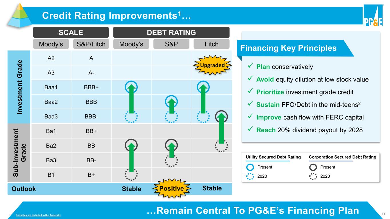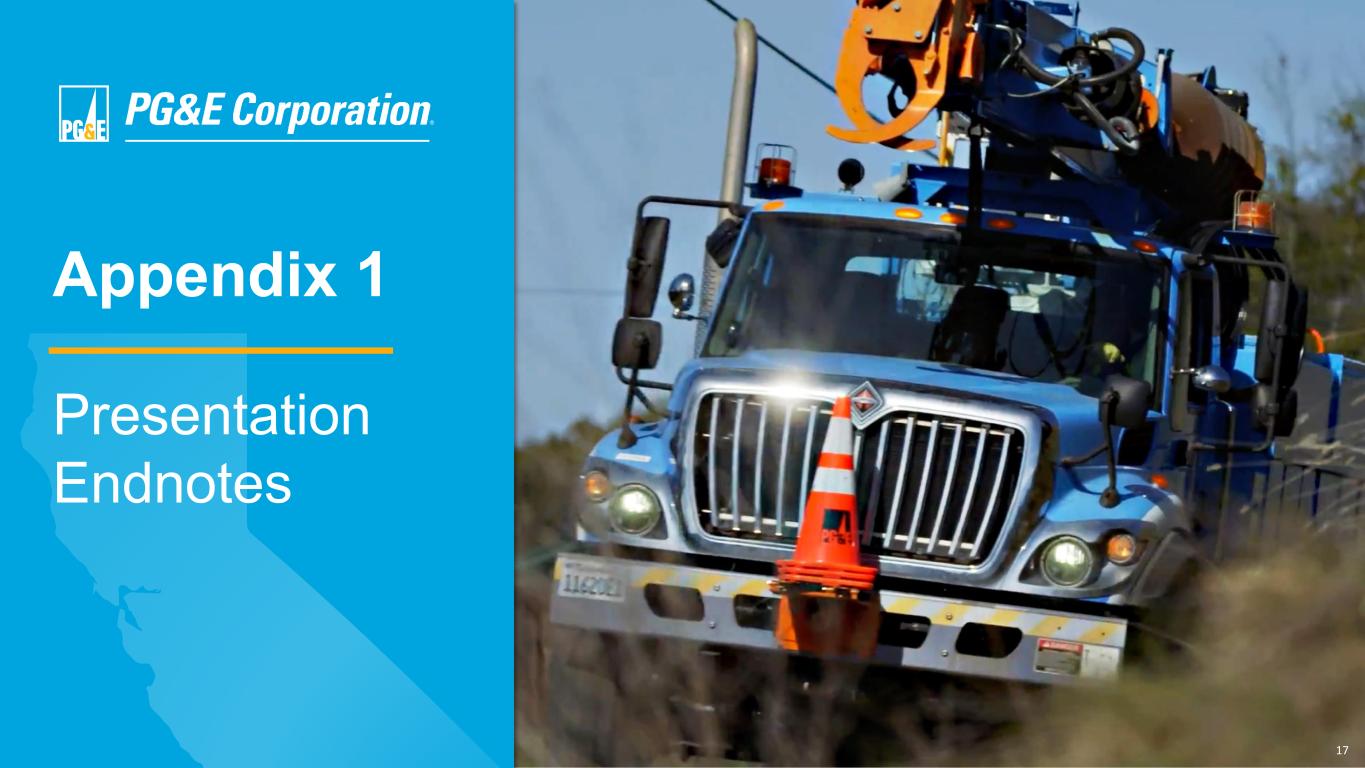20 Appendix 1: Presentation Endnotes Slide titles are hyperlinks Slide 23: Appendix 2: 2026 Factors Impacting Earnings 1. Non-GAAP core EPS is not calculated in accordance with GAAP. See Appendix 3, Exhibit E regarding non-GAAP financial measures. 2. The low end of the share count range assumes no PG&E Corporation mandatory convertible preferred shares (MCPs) have converted into common stock. The high end of the range assumes all of the MCPs have converted based on a PG&E Corporation common stock price of $20.55, consistent with the prospectus supplement filed December 3, 2024. 3. 2026 equity-earning weighted-average rate base reflects 2023 GRC final decision and the TO21 decision. 4. The capital structure of an investor-owned utility is the proportional authorization of shareholders’ equity and debt that comprise a company’s long-range financing or its capitalization. The CPUC currently authorized capital structure is comprised of 47.5% long-term debt, 0.5% preferred equity, and 52% common equity. 5. CPUC authorized ROE is pending resolution in the 2026 Cost of Capital filing. 6. Non-GAAP core earnings assumptions include no 2026 impacts from changes in the federal tax code. 7. Unrecoverable net interest includes PG&E Corporation long-term debt, Wildfire Fund contribution debt financing, and other interest above authorized, netted against the Utility’s balancing account interest. Slide 28: Appendix 2: Existing Protections Enhanced Pending Broader Policy Update 1. Prior to the enactment of AB 1054, utilities bore the burden of proving that their conduct was reasonable in order to obtain recovery of costs through rates. AB 1054 changed the standard so that the conduct of a utility is deemed reasonable unless a party to the proceeding creates a serious doubt as to the reasonableness of the utility’s conduct. Reasonable conduct is not limited to the optimum practice, method, or act to the exclusion of others, but rather encompasses a spectrum of possible practices, methods, or acts consistent with utility system needs, the interest of the ratepayers, and the requirements of governmental agencies of competent jurisdiction. 2. For fires in any calendar year. 3. SB 254 would, for a catastrophic wildfire that was ignited between January 1, 2025 and the effective date of SB 254, authorize an electrical corporation to file an application for a determination that the claims cannot be paid by the Wildfire Fund and for the issuance of a financing order in the amount of those claims before filing a prudency application. 4. Cap does not apply if Utility found to have acted with conscious or willful disregard of the rights and safety of others. Amount reflects 2025 electric transmission and distribution equity rate base. Slide 30: Appendix 2: SB 846 Diablo Canyon Legislation 1. The pre-extension period extended through the scheduled retirement dates of November 2024 and August 2025 for Units 1 and 2, respectively. 2. The extension period covers the additional 5-year life for each Unit.