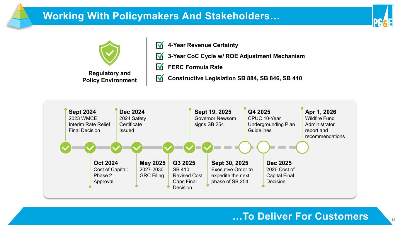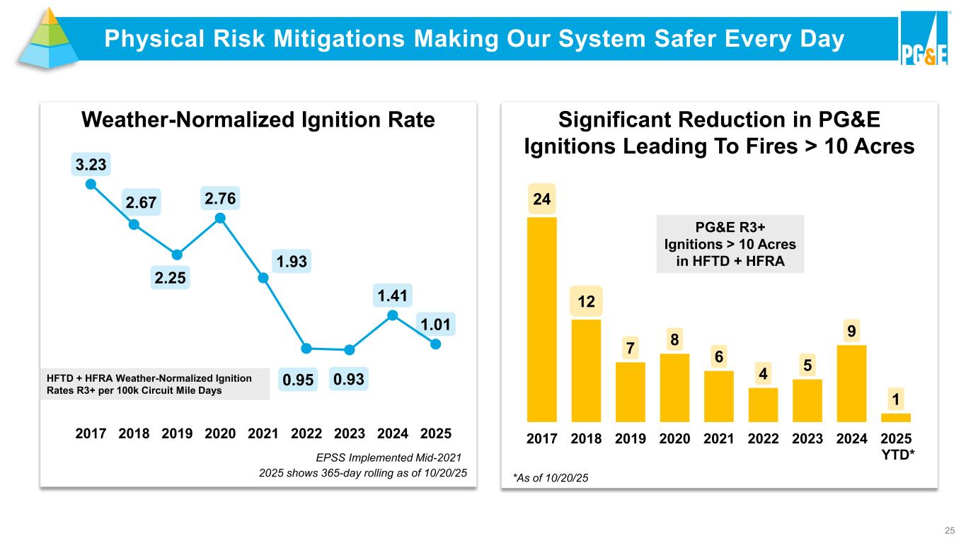 2 This presentation and the oral remarks made in connection with it contain statements regarding PG&E Corporation’s and Pacific Gas and Electric Company’s (the “Utility”) future performance, including expectations, objectives, and forecasts about operating results (including 2025 and 2026 non-GAAP core earnings), debt and equity issuances, refinancing activity, rate base growth, capital expenditures, cash flow, cost savings, customer bills, inflation, wildfire risk mitigation, wildfire-related cost recovery, dividends, load growth, operating and maintenance costs, financing efficiency, capital to expense ratio, technology (including AI) and regulatory developments. These statements and other statements that are not purely historical constitute forward-looking statements that are necessarily subject to various risks and uncertainties. Actual results may differ materially from those described in forward-looking statements. PG&E Corporation and the Utility are not able to predict all the factors that may affect future results. Factors that could cause actual results to differ materially include, but are not limited to, risks and uncertainties associated with: • wildfires that have occurred or may occur in the Utility’s service area, including the extent of the Utility’s liability in connection with the 2019 Kincade fire, the 2021 Dixie fire, the 2022 Mosquito fire, and future wildfires; • the Utility’s ability to recover wildfire-related costs, including costs for the 2021 Dixie fire, from the Wildfire Fund and Continuation Account (including the Utility’s maintenance of a valid safety certificate and whether the Wildfire Fund or Continuation Account has sufficient remaining funds), and through the WEMA and FERC TO rate cases; • the Utility’s implementation of its wildfire mitigation programs, including PSPS, EPSS, situational awareness and response, undergrounding, and the programs’ effectiveness; • the Utility’s ability to safely and reliably operate, maintain, construct, and decommission its facilities; • changes in the electric power and natural gas industries driven by technological advancements and a decarbonized economy; • a cyber incident, cybersecurity breach, or physical attack; • severe weather events, extended drought, and climate change, particularly their impact on the likelihood and severity of wildfires; • the impact of legislative and regulatory developments, including those regarding the Wildfire Fund, wildfires, the environment, California’s clean energy goals, the nuclear industry, extended operations at Diablo Canyon nuclear power plant, utilities’ transactions with their affiliates, municipalization, privacy, import tariffs, and taxes; • the timing and outcome of FERC and CPUC proceedings, including regarding ratemaking, cost recovery, and other matters; • the outcome of self-reports, agency compliance reports, investigations, or other enforcement actions; • PG&E Corporation and the Utility’s substantial indebtedness, which may adversely affect their financial health and limit their operating flexibility; • the timing and outcome of PG&E Corporation’s and the Utility’s litigation, including securities class action claims, and wildfire-related litigation; • the Utility’s ability to manage its costs effectively, timely recover costs through rates, and achieve projected savings and the extent of excess unrecoverable costs; • the tax treatment of certain assets and liabilities, including whether PG&E Corporation or the Utility undergoes an “ownership change” that limits certain tax attributes; • the impact of growing distributed and renewable generation resources, and changing customer demand for natural gas and electric services; • the Utility’s ability and cost to construct necessary infrastructure and the extent of customer demand for new load; and • the other factors disclosed in PG&E Corporation’s and the Utility’s joint Annual Report on Form 10-K for the year ended December 31, 2024, their joint Quarterly Form 10-Q for the quarter ended September 30, 2025 (the “Form 10-Q”), and other reports filed with the SEC, which are available on PG&E Corporation’s website at www.pgecorp.com and on the SEC’s website at www.sec.gov. Undefined, capitalized terms have the meanings set forth in the Form 10-Q. Unless otherwise indicated, the statements in this presentation are made as of October 23, 2025. PG&E Corporation and the Utility undertake no obligation to update information contained herein. This presentation was attached to PG&E Corporation’s and the Utility’s joint Current Report on Form 8-K that was furnished to the SEC on October 23, 2025, and is also available on PG&E Corporation’s website at www.pgecorp.com. Forward-Looking Statements