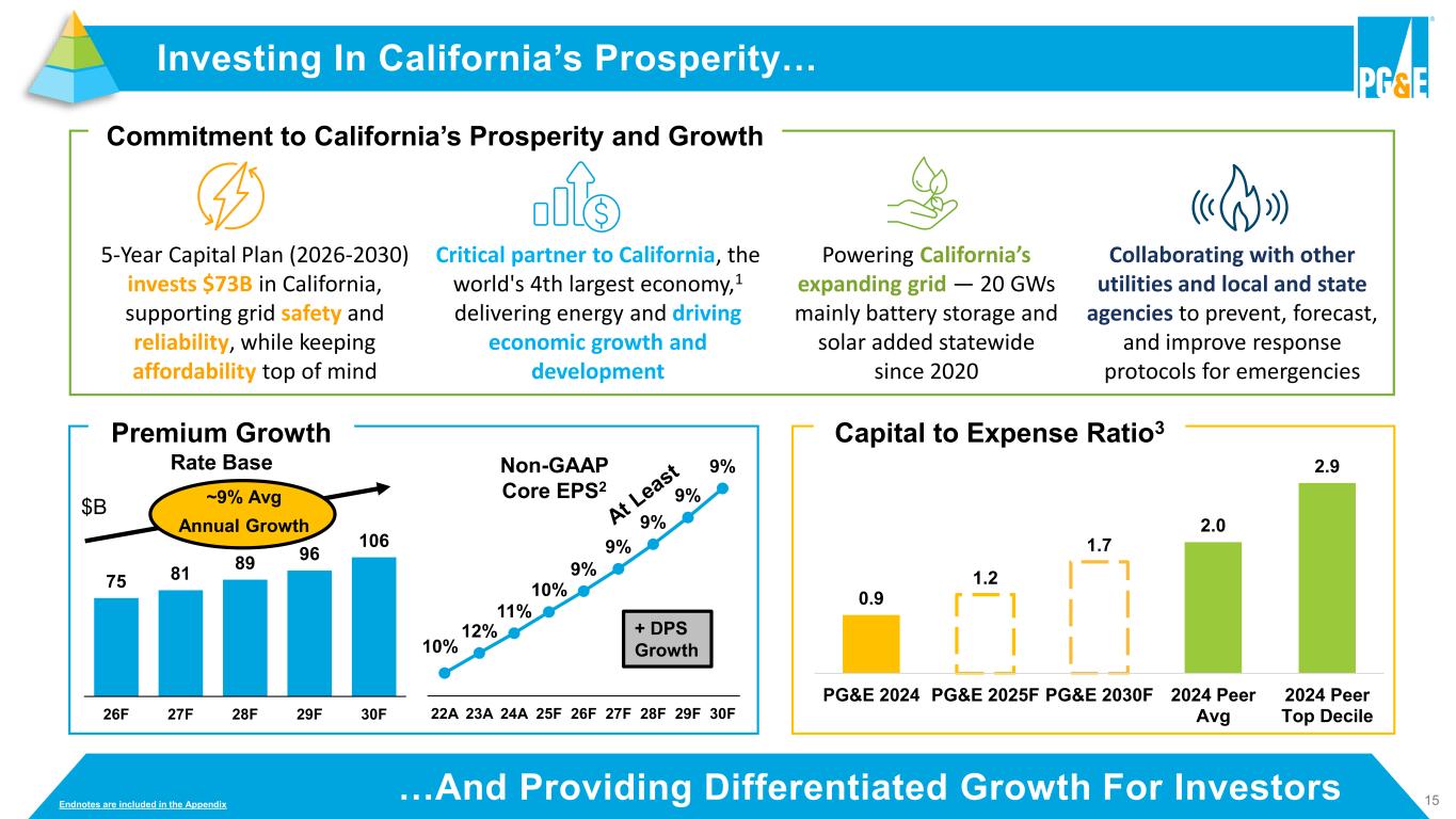 14…Benefits Customers AND Investors 2023A 2024A 2025F Future Customer Investment Rate Base Growth 14.5% 10.5% 9.5% CA Regulatory Ranking (RRA) Average/1 Average/1 Average/2 Above Average Affordable Model Non-Fuel O&M Reduction1 5½% 4% 2% 2% Load Growth2 Customer Bills3 Credit Ratings BB- /Ba2 BB /Ba1 Mid-teens FFO/Debt6 Consistent Performance Non-GAAP Core EPS Growth4 12% 11% 10% At Least 9% 2026 – 2030 Operating Cashflow $4.7B $8.0B $9B $10B+ Dividend Payout Ratio5 -- 3% 7% 20% Risk Reduction Safety Certification Valid through 12/11/25 Financial Common Dividend / Fire Victim Trust Exit Equity Issuance / Dividend Guidance Differentiated Performance… 1% - 3% 2% - 4% Stronger Valuation 2 ~9%7 Investment Grade 10 Endnotes are included in the Appendix