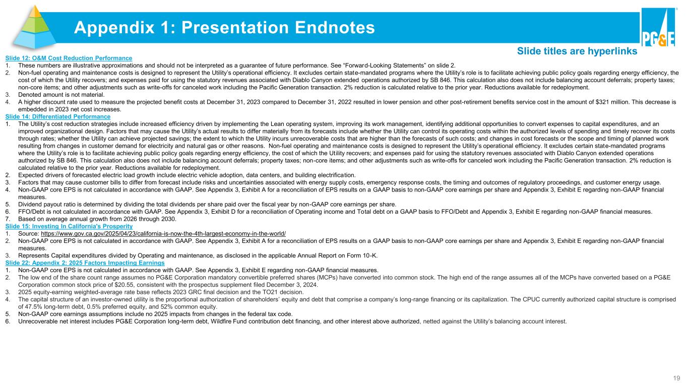 19 Appendix 1: Presentation Endnotes Slide titles are hyperlinks Slide 12: O&M Cost Reduction Performance 1. These numbers are illustrative approximations and should not be interpreted as a guarantee of future performance. See “Forward-Looking Statements” on slide 2. 2. Non-fuel operating and maintenance costs is designed to represent the Utility’s operational efficiency. It excludes certain state-mandated programs where the Utility’s role is to facilitate achieving public policy goals regarding energy efficiency, the cost of which the Utility recovers; and expenses paid for using the statutory revenues associated with Diablo Canyon extended operations authorized by SB 846. This calculation also does not include balancing account deferrals; property taxes; non-core items; and other adjustments such as write-offs for canceled work including the Pacific Generation transaction. 2% reduction is calculated relative to the prior year. Reductions available for redeployment. 3. Denoted amount is not material. 4. A higher discount rate used to measure the projected benefit costs at December 31, 2023 compared to December 31, 2022 resulted in lower pension and other post-retirement benefits service cost in the amount of $321 million. This decrease is embedded in 2023 net cost increases. Slide 14: Differentiated Performance 1. The Utility’s cost reduction strategies include increased efficiency driven by implementing the Lean operating system, improving its work management, identifying additional opportunities to convert expenses to capital expenditures, and an improved organizational design. Factors that may cause the Utility’s actual results to differ materially from its forecasts include whether the Utility can control its operating costs within the authorized levels of spending and timely recover its costs through rates; whether the Utility can achieve projected savings; the extent to which the Utility incurs unrecoverable costs that are higher than the forecasts of such costs; and changes in cost forecasts or the scope and timing of planned work resulting from changes in customer demand for electricity and natural gas or other reasons. Non-fuel operating and maintenance costs is designed to represent the Utility’s operational efficiency. It excludes certain state-mandated programs where the Utility’s role is to facilitate achieving public policy goals regarding energy efficiency, the cost of which the Ut ility recovers; and expenses paid for using the statutory revenues associated with Diablo Canyon extended operations authorized by SB 846. This calculation also does not include balancing account deferrals; property taxes; non-core items; and other adjustments such as write-offs for canceled work including the Pacific Generation transaction. 2% reduction is calculated relative to the prior year. Reductions available for redeployment. 2. Expected drivers of forecasted electric load growth include electric vehicle adoption, data centers, and building electrification. 3. Factors that may cause customer bills to differ from forecast include risks and uncertainties associated with energy supply costs, emergency response costs, the timing and outcomes of regulatory proceedings, and customer energy usage. 4. Non-GAAP core EPS is not calculated in accordance with GAAP. See Appendix 3, Exhibit A for a reconciliation of EPS results on a GAAP basis to non-GAAP core earnings per share and Appendix 3, Exhibit E regarding non-GAAP financial measures. 5. Dividend payout ratio is determined by dividing the total dividends per share paid over the fiscal year by non-GAAP core earnings per share. 6. FFO/Debt is not calculated in accordance with GAAP. See Appendix 3, Exhibit D for a reconciliation of Operating income and Total debt on a GAAP basis to FFO/Debt and Appendix 3, Exhibit E regarding non-GAAP financial measures. 7. Based on average annual growth from 2026 through 2030. Slide 15: Investing In California's Prosperity 1. Source: https://www.gov.ca.gov/2025/04/23/california-is-now-the-4th-largest-economy-in-the-world/ 2. Non-GAAP core EPS is not calculated in accordance with GAAP. See Appendix 3, Exhibit A for a reconciliation of EPS results on a GAAP basis to non-GAAP core earnings per share and Appendix 3, Exhibit E regarding non-GAAP financial measures. 3. Represents Capital expenditures divided by Operating and maintenance, as disclosed in the applicable Annual Report on Form 10-K. Slide 22: Appendix 2: 2025 Factors Impacting Earnings 1. Non-GAAP core EPS is not calculated in accordance with GAAP. See Appendix 3, Exhibit E regarding non-GAAP financial measures. 2. The low end of the share count range assumes no PG&E Corporation mandatory convertible preferred shares (MCPs) have converted into common stock. The high end of the range assumes all of the MCPs have converted based on a PG&E Corporation common stock price of $20.55, consistent with the prospectus supplement filed December 3, 2024. 3. 2025 equity-earning weighted-average rate base reflects 2023 GRC final decision and the TO21 decision. 4. The capital structure of an investor-owned utility is the proportional authorization of shareholders’ equity and debt that comprise a company’s long-range financing or its capitalization. The CPUC currently authorized capital structure is comprised of 47.5% long-term debt, 0.5% preferred equity, and 52% common equity. 5. Non-GAAP core earnings assumptions include no 2025 impacts from changes in the federal tax code. 6. Unrecoverable net interest includes PG&E Corporation long-term debt, Wildfire Fund contribution debt financing, and other interest above authorized, netted against the Utility’s balancing account interest.