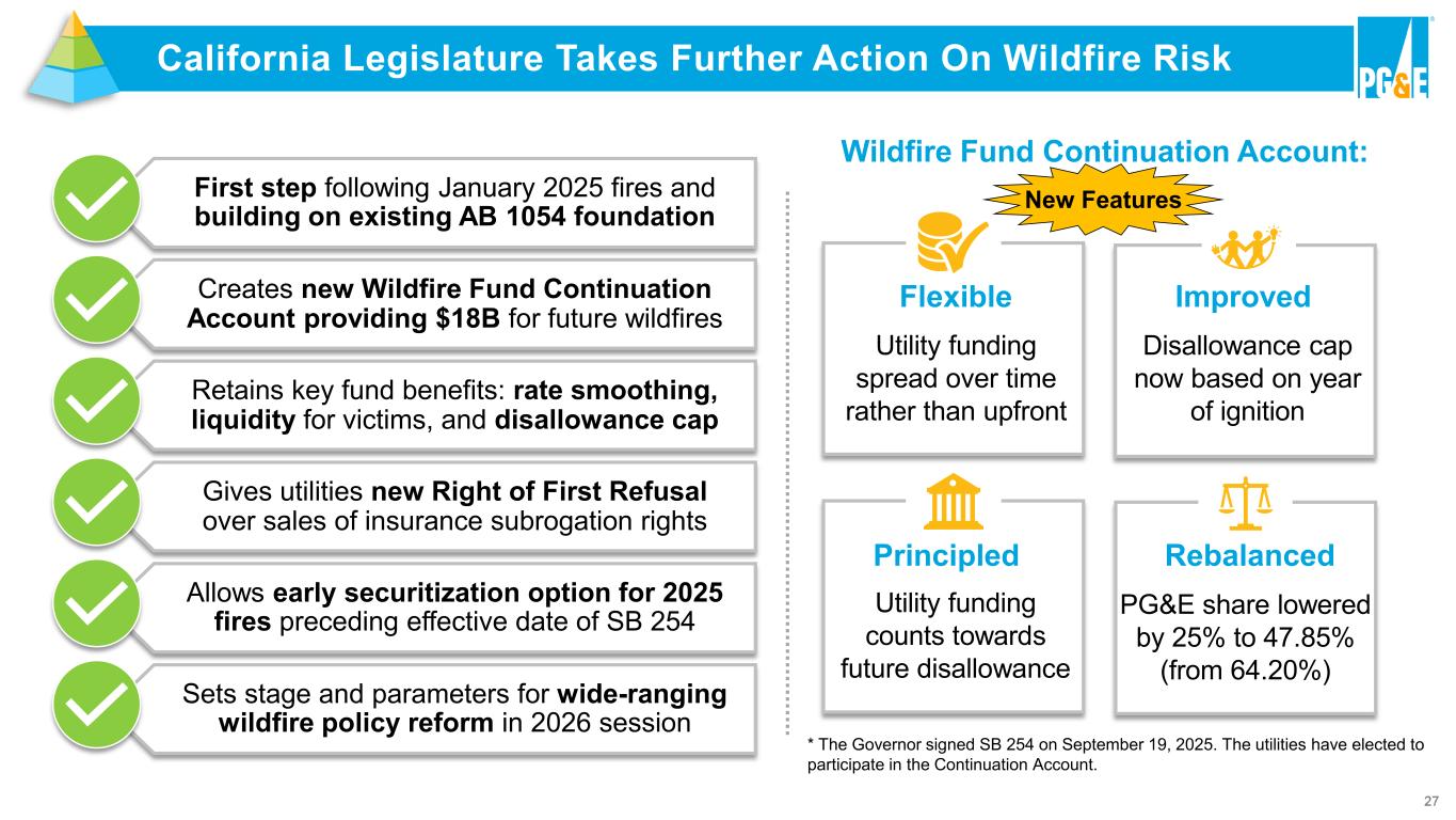 26 Wildfire Fund Continuation Account To Cover Future Wildfires Customer Annual Charge 2036-2045 ~$900M per year PG&E Monthly Bill: ~$3*** Utility Contingent Funding Over 5 years only if needed PG&E $373M per year Utility Annual Funding 2029-2045 $300M per year PG&E $144M $10.5 $9.0 $3.0 $5.1 $3.9 $7.5 > $21.0 B $18.0 B AB 1054 Wildfire Fund Continuation Account ** * Half of any unpaid contingent funding provided as a customer bill credit ** Bonding authority available *** Based on current assumptions Utility Upfront Funding 2019-2020 PG&E $4.8B Utility Annual Funding 2019-2028 $300M per year PG&E $193M Customer Annual Charge 2019-2035 ~$900M per year PG&E Monthly Bill: ~$3 * > **