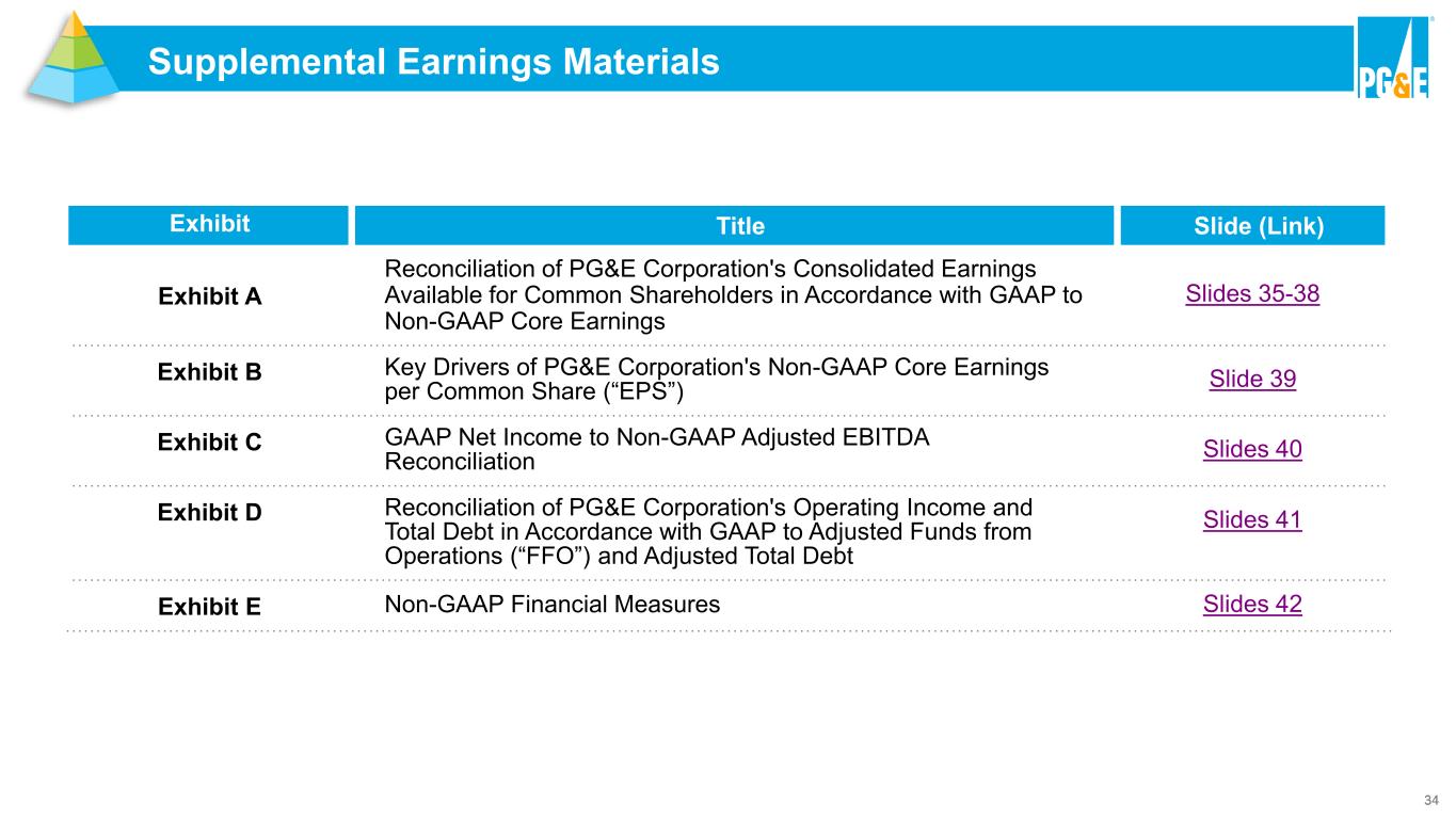 34 Supplemental Earnings Materials Exhibit Title Slide (Link) Exhibit A Reconciliation of PG&E Corporation's Consolidated Earnings Available for Common Shareholders in Accordance with GAAP to Non-GAAP Core Earnings Slides 35-38 Exhibit B Key Drivers of PG&E Corporation's Non-GAAP Core Earnings per Common Share (“EPS”) Slide 39 Exhibit C GAAP Net Income to Non-GAAP Adjusted EBITDA Reconciliation Slides 40 Exhibit D Reconciliation of PG&E Corporation's Operating Income and Total Debt in Accordance with GAAP to Adjusted Funds from Operations (“FFO”) and Adjusted Total Debt Slides 41 Exhibit E Non-GAAP Financial Measures Slides 42