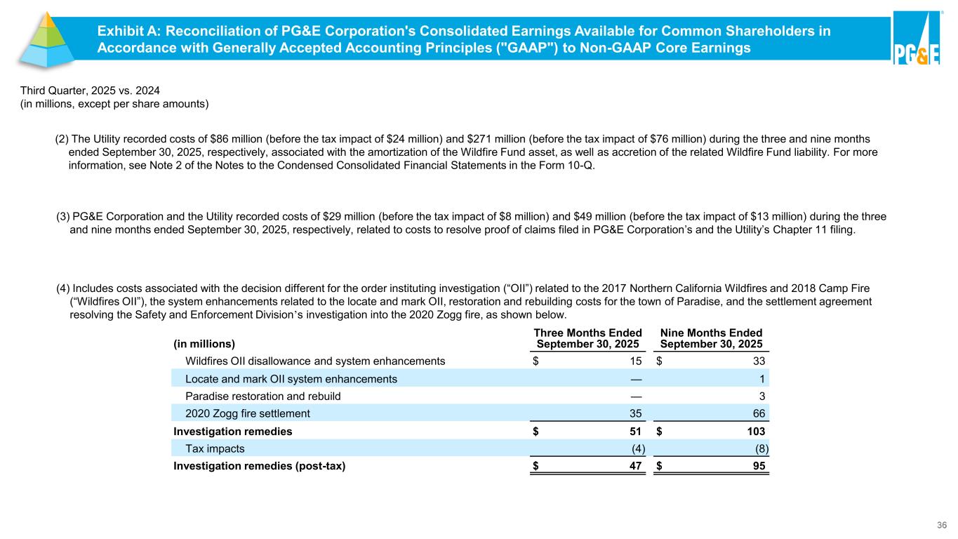 36 Third Quarter, 2025 vs. 2024 (in millions, except per share amounts) (3) PG&E Corporation and the Utility recorded costs of $29 million (before the tax impact of $8 million) and $49 million (before the tax impact of $13 million) during the three and nine months ended September 30, 2025, respectively, related to costs to resolve proof of claims filed in PG&E Corporation’s and the Utility’s Chapter 11 filing. (2) The Utility recorded costs of $86 million (before the tax impact of $24 million) and $271 million (before the tax impact of $76 million) during the three and nine months ended September 30, 2025, respectively, associated with the amortization of the Wildfire Fund asset, as well as accretion of the related Wildfire Fund liability. For more information, see Note 2 of the Notes to the Condensed Consolidated Financial Statements in the Form 10-Q. Exhibit A: Reconciliation of PG&E Corporation's Consolidated Earnings Available for Common Shareholders in Accordance with Generally Accepted Accounting Principles ("GAAP") to Non-GAAP Core Earnings Exhibit A: Reconciliation of PG&E Corporation's Consolidated Earnings Available for Common Shareholders in Accordance with Generally Accepted Accounting Principles ("GAAP") to Non-GAAP Core Earnings (4) Includes costs associated with the decision different for the order instituting investigation (“OII”) related to the 2017 Northern California Wildfires and 2018 Camp Fire (“Wildfires OII”), the system enhancements related to the locate and mark OII, restoration and rebuilding costs for the town of Paradise, and the settlement agreement resolving the Safety and Enforcement Division’s investigation into the 2020 Zogg fire, as shown below. (in millions) Three Months Ended September 30, 2025 Nine Months Ended September 30, 2025 Wildfires OII disallowance and system enhancements $ 15 $ 33 Locate and mark OII system enhancements — 1 Paradise restoration and rebuild — 3 2020 Zogg fire settlement 35 66 Investigation remedies $ 51 $ 103 Tax impacts (4) (8) Investigation remedies (post-tax) $ 47 $ 95