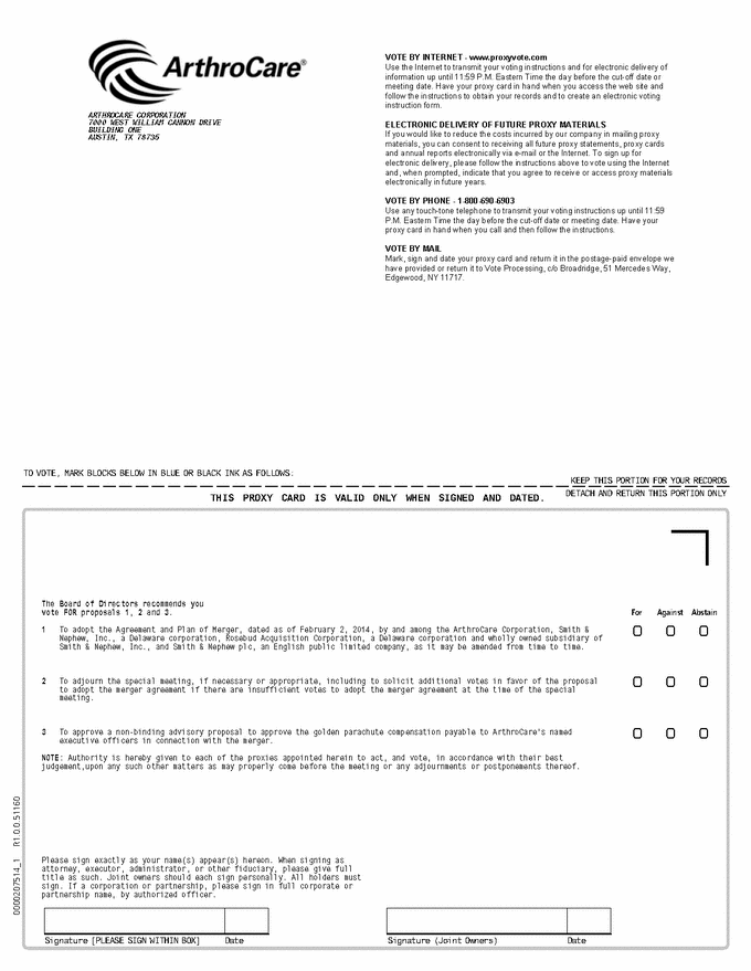 THIS PROXY CARD IS VALID ONLY WHEN SIGNED AND DATED. KEEP THIS PORTION FOR YOUR RECORDS DETACH AND RETURN THIS PORTION ONLY TO VOTE, MARK BLOCKS BELOW IN BLUE OR BLACK INK AS FOLLOWS: Signature (Joint Owners) Signature [PLEASE SIGN WITHIN BOX] Date Date 0 0 0 0 0 0 0 0 0 0000207514_1 R1.0.0.51160 ARTHROCARE CORPORATION 7000 WEST WILLIAM CANNON DRIVE BUILDING ONE AUSTIN, TX 78735 VOTE BY INTERNET - www.proxyvote.com Use the Internet to transmit your voting instructions and for electronic delivery of information up until 11:59 P.M. Eastern Time the day before the cut-off date or meeting date. Have your proxy card in hand when you access the web site and follow the instructions to obtain your records and to create an electronic voting instruction form. ELECTRONIC DELIVERY OF FUTURE PROXY MATERIALS If you would like to reduce the costs incurred by our company in mailing proxy materials, you can consent to receiving all future proxy statements, proxy cards and annual reports electronically via e-mail or the Internet. To sign up for electronic delivery, please follow the instructions above to vote using the Internet and, when prompted, indicate that you agree to receive or access proxy materials electronically in future years. VOTE BY PHONE - 1-800-690-6903 Use any touch-tone telephone to transmit your voting instructions up until 11:59 P.M. Eastern Time the day before the cut-off date or meeting date. Have your proxy card in hand when you call and then follow the instructions. VOTE BY MAIL Mark, sign and date your proxy card and return it in the postage-paid envelope we have provided or return it to Vote Processing, c/o Broadridge, 51 Mercedes Way, Edgewood, NY 11717. The Board of Directors recommends you vote FOR proposals 1, 2 and 3. For Against Abstain 1 To adopt the Agreement and Plan of Merger, dated as of February 2, 2014, by and among the ArthroCare Corporation, Smith & Nephew, Inc., a Delaware corporation, Rosebud Acquisition Corporation, a Delaware corporation and wholly owned subsidiary of Smith & Nephew, Inc., and Smith & Nephew plc, an English public limited company, as it may be amended from time to time. 2 To adjourn the special meeting, if necessary or appropriate, including to solicit additional votes in favor of the proposal to adopt the merger agreement if there are insufficient votes to adopt the merger agreement at the time of the special meeting. 3 To approve a non-binding advisory proposal to approve the golden parachute compensation payable to ArthroCare's named executive officers in connection with the merger. NOTE: Authority is hereby given to each of the proxies appointed herein to act, and vote, in accordance with their best judgement,upon any such other matters as may properly come before the meeting or any adjournments or postponements thereof. Please sign exactly as your name(s) appear(s) hereon. When signing as attorney, executor, administrator, or other fiduciary, please give full title as such. Joint owners should each sign personally. All holders must sign. If a corporation or partnership, please sign in full corporate or partnership name, by authorized officer.  |