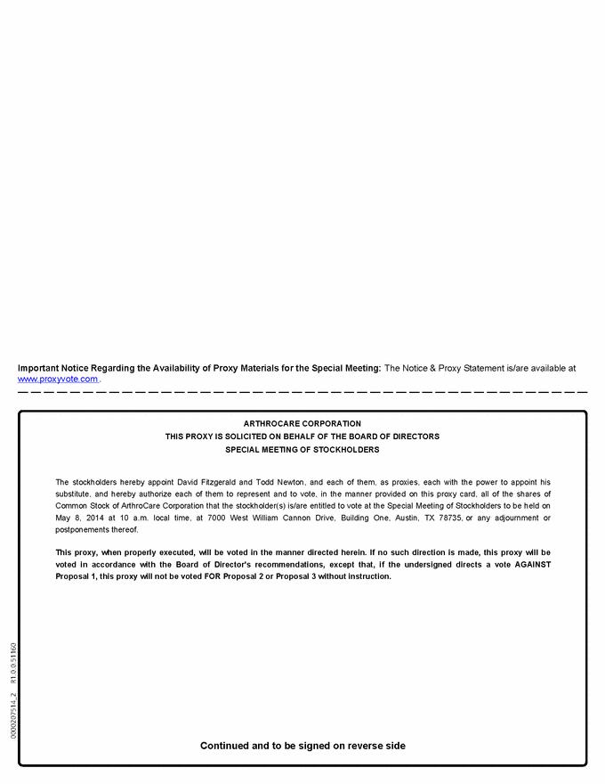 0000207514_2 R1.0.0.51160 Important Notice Regarding the Availability of Proxy Materials for the Special Meeting: The Notice & Proxy Statement is/are available at www.proxyvote.com . ARTHROCARE CORPORATION THIS PROXY IS SOLICITED ON BEHALF OF THE BOARD OF DIRECTORS SPECIAL MEETING OF STOCKHOLDERS The stockholders hereby appoint David Fitzgerald and Todd Newton, and each of them, as proxies, each with the power to appoint his substitute, and hereby authorize each of them to represent and to vote, in the manner provided on this proxy card, all of the shares of Common Stock of ArthroCare Corporation that the stockholder(s) is/are entitled to vote at the Special Meeting of Stockholders to be held on May 8, 2014 at 10 a.m. local time, at 7000 West William Cannon Drive, Building One, Austin, TX 78735, or any adjournment or postponements thereof. This proxy, when properly executed, will be voted in the manner directed herein. If no such direction is made, this proxy will be voted in accordance with the Board of Director's recommendations, except that, if the undersigned directs a vote AGAINST Proposal 1, this proxy will not be voted FOR Proposal 2 or Proposal 3 without instruction. Continued and to be signed on reverse side  |
