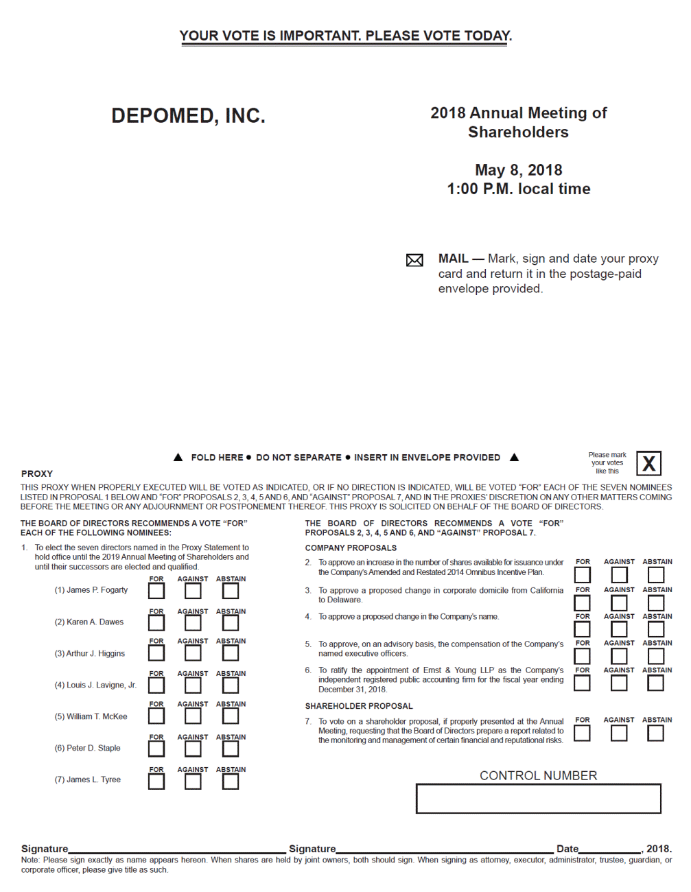 YOUR VOTE IS IMPORTANT. PLEASE VOTE TODAY. DEPOMED, INC. 2018 Annual Meeting of Shareholders May 8, 2018 1:00 P.M. local time MAIL — Mark, sign and date your proxy card and return it in the postage-paid envelope provided. Please mark your votes like this FOLD HEREDO NOT SEPARATE INSERT IN ENVELOPE PROVIDED PROXY THIS PROXY WHEN PROPERLY EXECUTED WILL BE VOTED AS INDICATED, OR IF NO DIRECTION IS INDICATED, WILL BE VOTED “FOR” EACH OF THE SEVEN NOMINEES LISTED IN PROPOSAL 1 BELOW AND “FOR” PROPOSALS 2, 3, 4, 5 AND 6, AND “AGAINST” PROPOSAL 7, AND IN THE PROXIES’ DISCRETION ON ANY OTHER MATTERS COMING BEFORE THE MEETING OR ANY ADJOURNMENT OR POSTPONEMENT THEREOF. THIS PROXY IS SOLICITED ON BEHALF OF THE BOARD OF DIRECTORS. THE BOARD OF DIRECTORS RECOMMENDS A VOTE “FOR” EACH OF THE FOLLOWING NOMINEES: THE BOARD OF DIRECTORS RECOMMENDS A VOTE “FOR” PROPOSALS 2, 3, 4, 5 AND 6, AND “AGAINST” PROPOSAL 7. COMPANY PROPOSALS 1. To elect the seven directors named in the Proxy Statement to hold office until the 2019 Annual Meeting of Shareholders and until their successors are elected and qualified. 2. To approve an increase in the number of shares available for issuance under the Company’s Amended and Restated 2014 Omnibus Incentive Plan. FOR AGAINST ABSTAIN FOR AGAINST ABSTAIN (1) James P. Fogarty 3. To approve a proposed change in corporate domicile from California to Delaware. FOR AGAINST ABSTAIN FOR AGAINST ABSTAIN 4. To approve a proposed change in the Company’s name. FOR AGAINST ABSTAIN (2) Karen A. Dawes FOR AGAINST ABSTAIN 5. To approve, on an advisory basis, the compensation of the Company’s named executive officers. To ratify the appointment of Ernst & Young LLP as the Company’s independent registered public accounting firm for the fiscal year ending December 31, 2018. FOR AGAINST ABSTAIN (3) Arthur J. Higgins 6. FOR AGAINST ABSTAIN FOR AGAINST ABSTAIN (4) Louis J. Lavigne, Jr. FOR AGAINST ABSTAIN SHAREHOLDER PROPOSAL (5) William T. McKee FOR AGAINST ABSTAIN 7. To vote on a shareholder proposal, if properly presented at the Annual Meeting, requesting that the Board of Directors prepare a report related to the monitoring and management of certain financial and reputational risks. FOR AGAINST ABSTAIN (6) Peter D. Staple FOR AGAINST ABSTAIN CONTROL NUMBER (7) James L. Tyree Signature Signature Date , 2018. Note: Please sign exactly as name appears hereon. When shares are held by joint owners, both should sign. When signing as attorney, executor, administrator, trustee, guardian, or corporate officer, please give title as such. X
