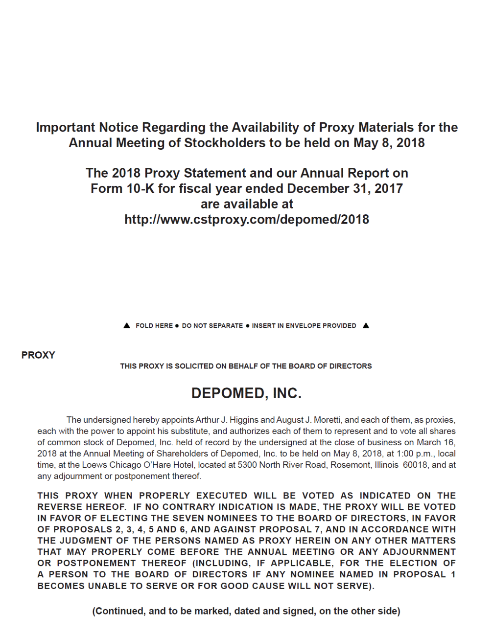 Important Notice Regarding the Availability of Proxy Materials for the Annual Meeting of Stockholders to be held on May 8, 2018 The 2018 Proxy Statement and our Annual Report on Form 10-K for fiscal year ended December 31, 2017 are available at http://www.cstproxy.com/depomed/2018 FOLD HEREDO NOT SEPARATEINSERT IN ENVELOPE PROVIDED PROXY THIS PROXY IS SOLICITED ON BEHALF OF THE BOARD OF DIRECTORS DEPOMED, INC. The undersigned hereby appoints Arthur J. Higgins and August J. Moretti, and each of them, as proxies, each with the power to appoint his substitute, and authorizes each of them to represent and to vote all shares of common stock of Depomed, Inc. held of record by the undersigned at the close of business on March 16, 2018 at the Annual Meeting of Shareholders of Depomed, Inc. to be held on May 8, 2018, at 1:00 p.m., local time, at the Loews Chicago O’Hare Hotel, located at 5300 North River Road, Rosemont, Illinois 60018, and at any adjournment or postponement thereof. THIS PROXY WHEN PROPERLY EXECUTED WILL BE VOTED AS INDICATED ON THE REVERSE HEREOF. IF NO CONTRARY INDICATION IS MADE, THE PROXY WILL BE VOTED IN FAVOR OF ELECTING THE SEVEN NOMINEES TO THE BOARD OF DIRECTORS, IN FAVOR OF PROPOSALS 2, 3, 4, 5 AND 6, AND AGAINST PROPOSAL 7, AND IN ACCORDANCE WITH THE JUDGMENT OF THE PERSONS NAMED AS PROXY HEREIN ON ANY OTHER MATTERS THAT MAY PROPERLY COME BEFORE THE ANNUAL MEETING OR POSTPONEMENT THEREOF (INCLUDING, IF APPLICABLE, A PERSON TO THE BOARD OF DIRECTORS IF ANY NOMINEE OR ANY ADJOURNMENT FOR THE ELECTION OF NAMED IN PROPOSAL 1 BECOMES UNABLE TO SERVE OR FOR GOOD CAUSE WILL NOT SERVE). (Continued, and to be marked, dated and signed, on the other side)