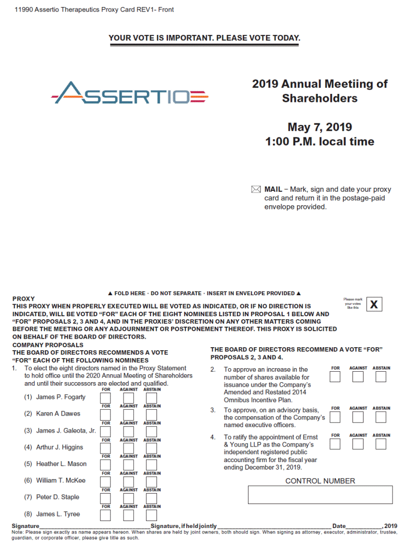 11990 Assertio Therapeutics Proxy Card REV1-Front YOUR VOTE IS IMPORTANT. PLEASE VOTE TODAY. 2019 Annual Meetiing of Shareholders May 7, 2019 1:00 P.M. local time MAIL – Mark, sign and date your proxy card and return it in the postage-paid envelope provided. FOLD HERE • DO NOT SEPARATE • INSERT IN ENVELOPE PROVIDED PROXY Please mark your votes like this THIS PROXY WHEN PROPERLY EXECUTED WILL BE VOTED AS INDICATED, OR IF NO DIRECTION IS INDICATED, WILL BE VOTED “FOR” EACH OF THE EIGHT NOMINEES LISTED IN PROPOSAL 1 BELOW AND “FOR” PROPOSALS 2, 3 AND 4, AND IN THE PROXIES’ DISCRETION ON ANY OTHER MATTERS COMING BEFORE THE MEETING OR ANY ADJOURNMENT OR POSTPONEMENT THEREOF. THIS PROXY IS SOLICITED ON BEHALF OF THE BOARD OF DIRECTORS. COMPANY PROPOSALS THE BOARD OF DIRECTORS RECOMMENDS A VOTE “FOR” EACH OF THE FOLLOWING NOMINEES 1.To elect the eight directors named in the Proxy Statement to hold office until the 2020 Annual Meeting of Shareholders and until their successors are elected and qualified. THE BOARD OF DIRECTORS RECOMMEND A VOTE “FOR” PROPOSALS 2, 3 AND 4. FOR AGAINST ABSTAIN 2. To approve an increase in the number of shares available for issuance under the Company’s Amended and Restated 2014 Omnibus Incentive Plan. To approve, on an advisory basis, the compensation of the Company’s named executive officers. To ratify the appointment of Ernst & Young LLP as the Company’s independent registered public accounting firm for the fiscal year ending December 31, 2019. FOR AGAINST ABSTAIN (1) James P. Fogarty FOR AGAINST ABSTAIN FOR AGAINST ABSTAIN 3. (2) Karen A Dawes FOR AGAINST ABSTAIN (3) James J. Galeota, Jr. FOR AGAINST ABSTAIN 4. FOR AGAINST ABSTAIN (4) Arthur J. Higgins FOR AGAINST ABSTAIN (5) Heather L. Mason FOR AGAINST ABSTAIN CONTROL NUMBER (6) William T. McKee FOR AGAINST ABSTAIN (7) Peter D. Staple FOR AGAINST ABSTAIN (8) James L. Tyree Signature Signature, if held jointly Date , 2019 Note: Please sign exactly as name appears hereon. When shares are held by joint owners, both should sign. When signing as attorney, executor, administrator, trustee, guardian, or corporate officer, please give title as such. X