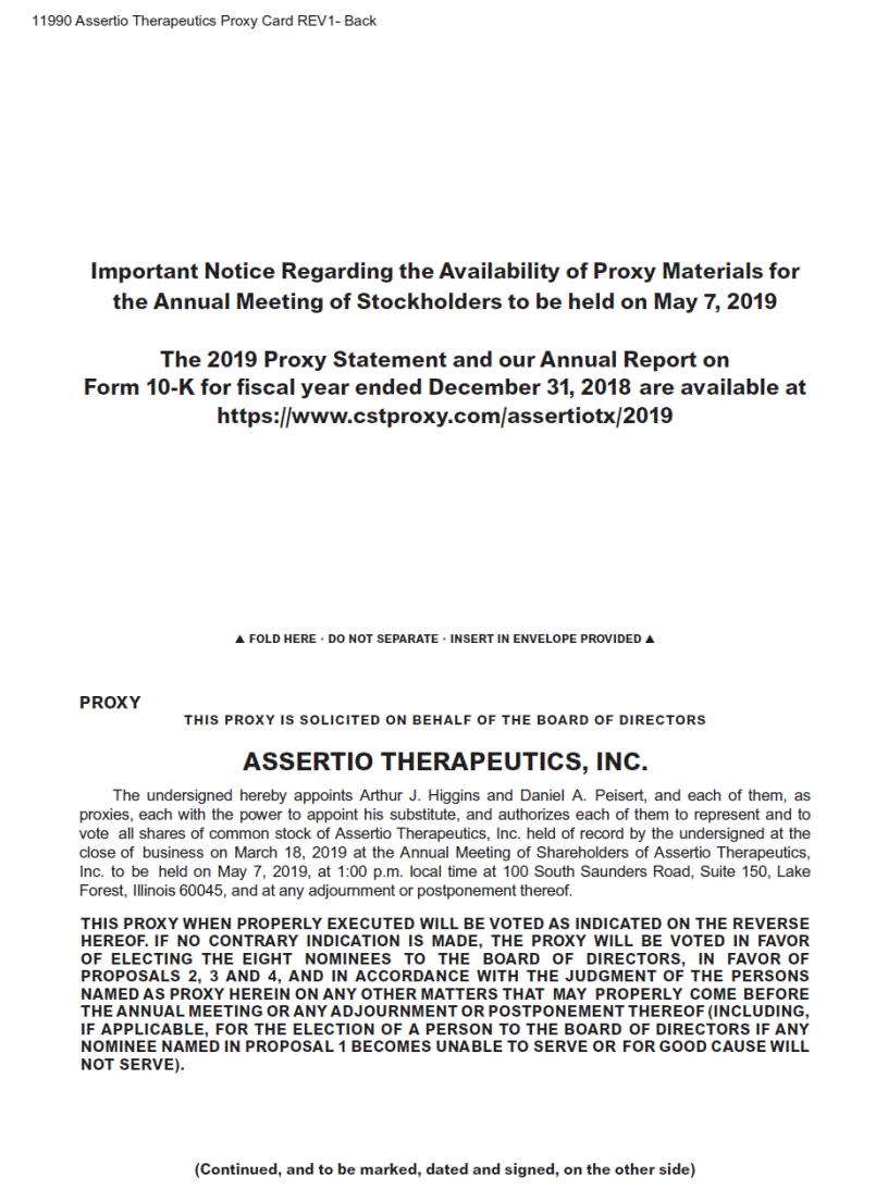 11990 Assertio Therapeutics Proxy Card REV1-Back Important Notice Regarding the Availability of Proxy Materials for the Annual Meeting of Stockholders to be held on May 7, 2019 The 2019 Proxy Statement and our Annual Report on Form 10-K for fiscal year ended December 31, 2018 are available at https://www.cstproxy.com/assertiotx/2019 FOLD HERE • DO NOT SEPARATE • INSERT IN ENVELOPE PROVIDED PROXY THIS PROXY IS SOLICITED ON BEHALF OF THE BOARD OF DIRECTORS ASSERTIO THERAPEUTICS, INC. The undersigned hereby appoints Arthur J. Higgins and Daniel A. Peisert, and each of them, as proxies, each with the power to appoint his substitute, and authorizes each of them to represent and to vote all shares of common stock of Assertio Therapeutics, Inc. held of record by the undersigned at the close of business on March 18, 2019 at the Annual Meeting of Shareholders of Assertio Therapeutics, Inc. to be held on May 7, 2019, at 1:00 p.m. local time at 100 South Saunders Road, Suite 150, Lake Forest, Illinois 60045, and at any adjournment or postponement thereof. THIS PROXY WHEN PROPERLY EXECUTED WILL BE VOTED AS INDICATED ON THE REVERSE HEREOF. IF NO CONTRARY INDICATION IS MADE, THE PROXY WILL BE VOTED IN FAVOR OF ELECTING THE EIGHT NOMINEES TO THE BOARD OF DIRECTORS, IN FAVOR OF PROPOSALS 2, 3 AND 4, AND IN ACCORDANCE WITH THE JUDGMENT OF THE PERSONS NAMED AS PROXY HEREIN ON ANY OTHER MATTERS THAT MAY PROPERLY COME BEFORE THE ANNUAL MEETING OR ANY ADJOURNMENT OR POSTPONEMENT THEREOF (INCLUDING, IF APPLICABLE, FOR THE ELECTION OF A PERSON TO THE BOARD OF DIRECTORS IF ANY NOMINEE NAMED IN PROPOSAL 1 BECOMES UNABLE TO SERVE OR FOR GOOD CAUSE WILL NOT SERVE). (Continued, and to be marked, dated and signed, on the other side)