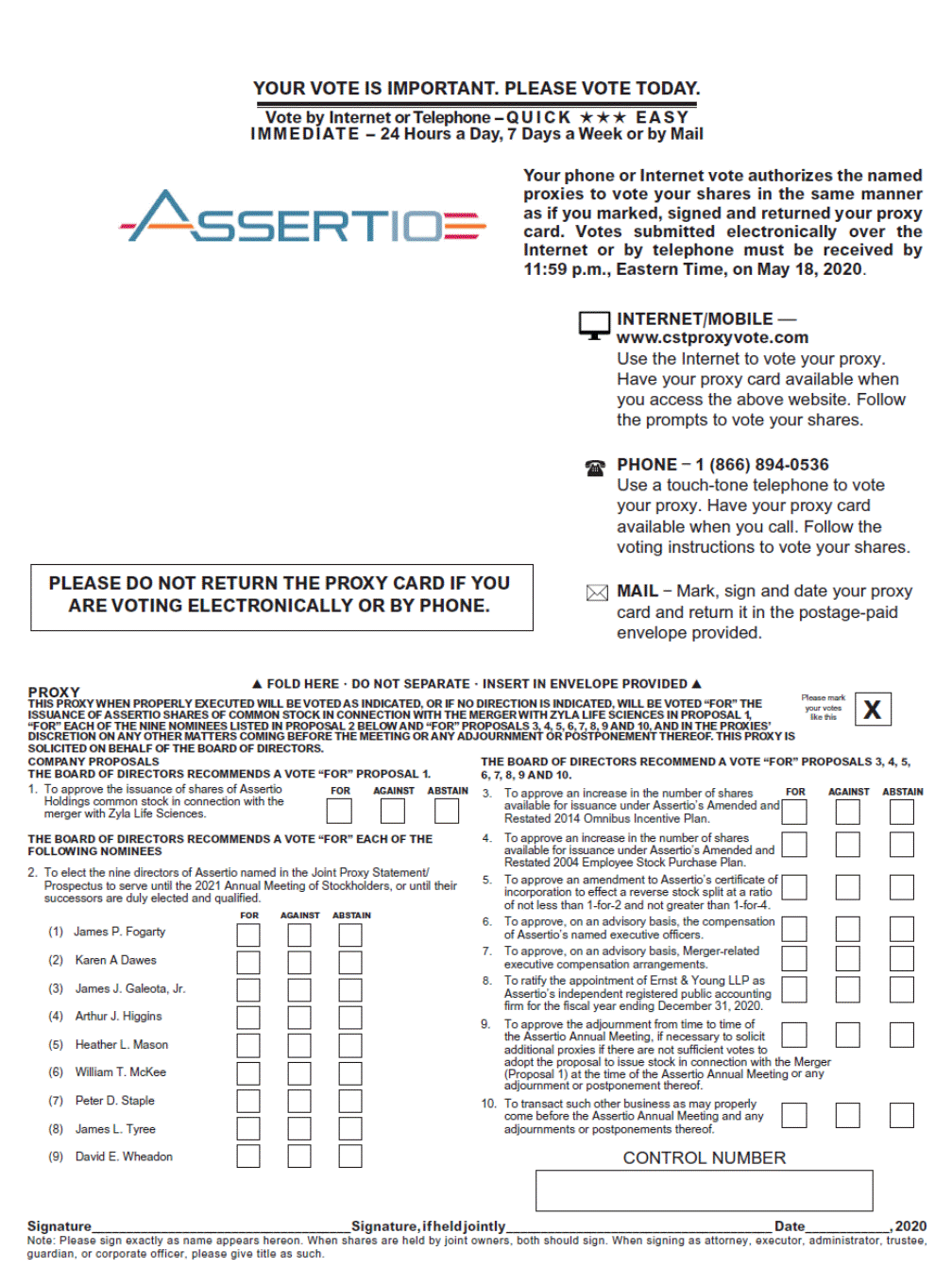 YOUR VOTE IS IMPORTANT. PLEASE VOTE TODAY. Vote by Internet or Telephone - QUIC K EAS Y IMMEDIATE - 24 Hours a Day, 7 Days a Week or by Mail Your phone or Internet vote authorizes the named proxies to vote your shares in the same manner as if you marked, signed and returned your proxy card. Votes submitted electronically over the Internet or by telephone must be received by 11:59 p.m., Eastern Time, on May 18, 2020. INTERNET/MOBILE – www.cstproxyvote.com Use the Internet to vote your proxy. Have your proxy card available when you access the above website. Follow the prompts to vote your shares. PHONE – 1 (866) 894-0536 Use a touch-tone telephone to vote your proxy. Have your proxy card available when you call. Follow the voting instructions to vote your shares. MAIL – Mark, sign and date your proxy card and return it in the postage-paid envelope provided. FOLD HERE • DO NOT SEPARATE • INSERT IN ENVELOPE PROVIDED PROXY Please mark your votes like this THIS PROXY WHEN PROPERLY EXECUTED WILL BE VOTED AS INDICATED, OR IF NO DIRECTION IS INDICATED, WILL BE VOTED “FOR” THE ISSUANCE OF ASSERTIO SHARES OF COMMON STOCK IN CONNECTION WITH THE MERGER WITH ZYLA LIFE SCIENCES IN PROPOSAL 1, “FOR” EACH OF THE NINE NOMINEES LISTED IN PROPOSAL 2 BELOW AND “FOR” PROPOSALS 3, 4, 5, 6, 7, 8, 9 AND 10, AND IN THE PROXIES’ DISCRETION ON ANY OTHER MATTERS COMING BEFORE THE MEETING OR ANY ADJOURNMENT OR POSTPONEMENT THEREOF. THIS PROXY IS SOLICITED ON BEHALF OF THE BOARD OF DIRECTORS. COMPANY PROPOSALS THE BOARD OF DIRECTORS RECOMMENDS A VOTE “FOR” PROPOSAL 1. THE BOARD OF DIRECTORS RECOMMEND A VOTE “FOR” PROPOSALS 3, 4, 5, 6, 7, 8, 9 AND 10. 1. To approve the issuance of shares of Assertio Holdings common stock in connection with the merger with Zyla Life Sciences. FOR AGAINST ABSTAIN FOR AGAINST ABSTAIN 3. To approve an increase in the number of shares available for issuance under Assertio’s Amended and Restated 2014 Omnibus Incentive Plan. To approve an increase in the number of shares available for issuance under Assertio’s Amended and Restated 2004 Employee Stock Purchase Plan. To approve an amendment to Assertio’s certificate of incorporation to effect a reverse stock split at a ratio of not less than 1-for-2 and not greater than 1-for-20. To approve, on an advisory basis, the compensation of Assertio’s named executive officers. To approve, on an advisory basis, Merger-related executive compensation arrangements. To ratify the appointment of Ernst & Young LLP as Assertio’s independent registered public accounting firm for the fiscal year ending December 31, 2020. To approve the adjournment from time to time of the Assertio Annual Meeting, if necessary to solicit additional proxies if there are not sufficient votes to THE BOARD OF DIRECTORS RECOMMENDS A VOTE “FOR” EACH OF THE FOLLOWING NOMINEES 4. 2. To elect the nine directors of Assertio named in the Joint Proxy Statement/ Prospectus to serve until the 2021 Annual Meeting of Stockholders, or until their successors are duly elected and qualified. 5. FOR AGAINST ABSTAIN 6. (1) James P. Fogarty 7. (2) Karen A Dawes 8. (3) James J. Galeota, Jr. (4) Arthur J. Higgins 9. (5) Heather L. Mason adopt the proposal to issue stock in connection with the Merger (Proposal 1) at the time of the Assertio Annual Meeting or any adjournment or postponement thereof. (6) William T. McKee (7) Peter D. Staple 10. To transact such other business as may properly come before the Assertio Annual Meeting and any adjournments or postponements thereof. (8) James L. Tyree CONTROL NUMBER (9) David E. Wheadon Signature Signature, if held jointly Date , 2020 Note: Please sign exactly as name appears hereon. When shares are held by joint owners, both should sign. When signing as attorney, executor, administrator, trustee, guardian, or corporate officer, please give title as such. X PLEASE DO NOT RETURN THE PROXY CARD IF YOU ARE VOTING ELECTRONICALLY OR BY PHONE.
