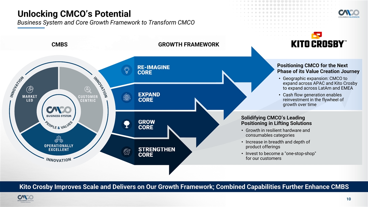 Strong Track Record of Creating Value Through M&A and Executing on Synergies Legend: Acquisition Divestiture December 2021 September 2015 January 2017 April 2021 December 2021 M Ma ay y 2023 2023 February 2025 January 2017 April 2021 Acquisition of STAHL Acquisition of Dorner for Acquisition of Magnetek, CraneSystems from $485M advances Intelligent Acquisition of Garvey for Acquisition of montratec Announced the acquisition Inc. for $182M added Konecranes for $218M Motion strategy and $74M expands conveying for $110M expands of Kito Crosby for $2.7B automation capabilities strengthens leading global creates platform for solutions platform precision conveyance and position in lifting solutions scalable growth automation M&A Pipeline Target Screen 2015 2016 2017 2018 2019 2020 2021 2022 2023 2024 2025 2026 Acquisition Committee Feedback Outreach Due Diligence December 2018 February 2019 February 2019 January 2026 Decision Divestiture Tire Shredder Announced divestiture of Divestiture of Tire Shredder Divestiture of Crane Programmatic Divestiture of Stahlhammer U.S. power chain hoist and Business Equipment and Service, Inc. Bommern GmbH chain operations M&A Transforming Columbus McKinnon into a Top-Tier, Higher Growth, Higher Margin Enterprise 9