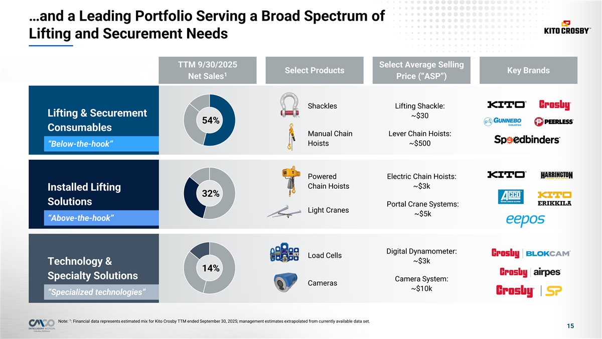 …with Exposure to Attractive, Growing End Markets 1 OVERVIEW OF END MARKET EXPOSURE 2024E – 2029E CAGR 2 Other Infrastructure 4 – 5% Market Growth Energy & Utilities Significant government investment in revitalization Infrastructure Manufacturing 5 – 6% Corporates leading re-shoring initiatives, supporting Market Growth legislation 12% Food & Beverage 17% 3 – 4% Oil & Gas Market Growth Capex underinvestment relative to demand 6% Metals & Mining 6% 5 – 6% Electrification and energy storage require significant Market Growth 15% Transportation Construction consumption of key minerals 7% Construction 4 – 5% Datacenter and semiconductor investments; new Market Growth warehouse builds Manufacturing 12% 14% Food and Beverage 6 – 7% Metals & Mining Population growth, increasing food security focus and 12% Market Growth sustainability initiatives Energy & Utilities 6 – 7% Oil & Gas Market Growth Energy transition investments 5 – 6% Entertainment Market Growth Pent-up investment and replacement spend 1 Note: Financial data represents; estimated mix for Kito Crosby TTM ended September 30, 2025; management estimates extrapolated from currently Source: Oxford Economics; L.E.K. research and analysis as of November 2024 2 available data set; Other represents Aerospace & Government (5%), E-Commerce (2%), Entertainment (1%) and Other verticals (5%) 14