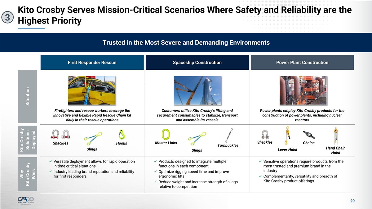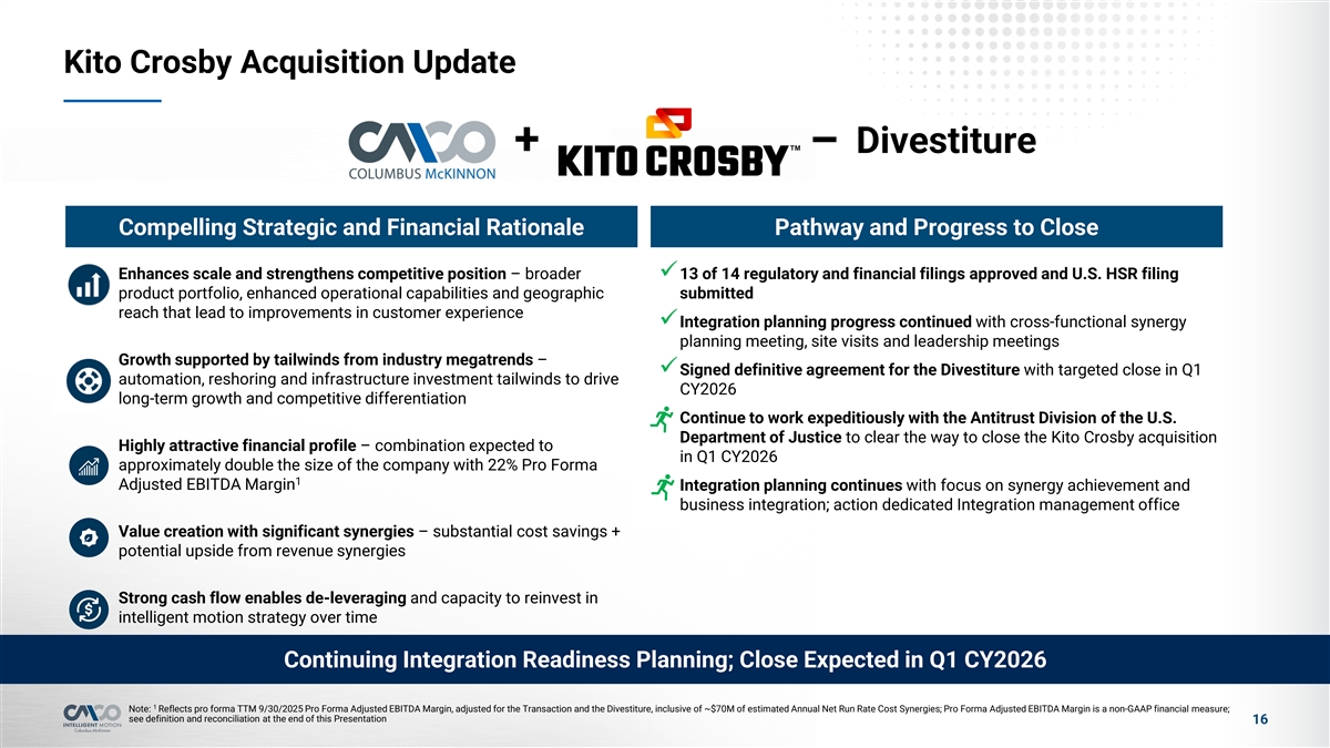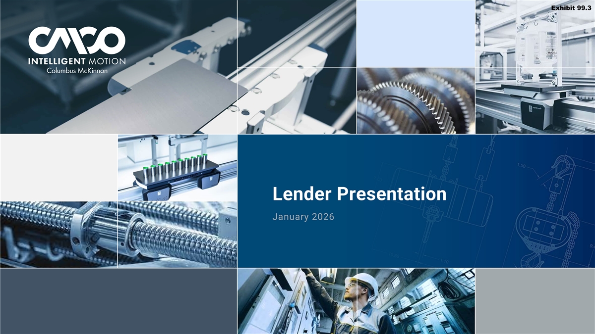 Disclaimer Safe Harbor Statement This presentation and the accompanying oral discussion contain “forward-looking statements” within the meaning of Section 27A of the Securities Act of 1933, as amended, and Section 21E of the Securities Exchange Act of 1934, as amended. Such forward looking statements are generally identified by the use of forward-looking terminology, including the terms anticipate, “believe,” “continue,” “could,” “estimate,” “expect,” “illustrative,” “intend,” “likely,” “may,” “opportunity,” “plan,” “possible,” “potential,” “predict,” “project,” “shall,” “should,” “target,” “will,” “would” and, in each case, their negative or other various or comparable terminology. Such forward-looking statements include, among others, statements regarding: (1) our strategy, outlook and growth prospects; (2) our operational and financial targets and capital allocation policy; (3) general economic trends, global policy, including tariff policy, trends in our industry and markets and their expected impacts on Columbus McKinnon; (4) the amount of debt to be paid down by Columbus McKinnon during the 2026 fiscal year and the amount of cost and revenue synergies expected to be achieved after the completion of the Kito Crosby acquisition; (5) the expected benefits of the Kito Crosby acquisition; (6) the expected future financial results of the combined companies and (7) the expected timing for the closing of the Kito Crosby acquisition and the Divestiture. Forward-looking statements are not based on historical facts, but instead represent our current expectations and assumptions regarding our business, the economy and other future conditions, and involve known and unknown risks, uncertainties and other factors that could cause the actual results, performance or achievements of Columbus McKinnon to differ materially from any future results, performance or achievements expressed or implied by the forward-looking statements. It is not possible to predict or identify all such risks. These risks include, but are not limited to, (1) risks relating to the competitive environment in which we operate; (2) the risk that the cost synergies and any revenue synergies from the Kito Crosby transaction may not be fully realized or may take longer than anticipated to be realized; (3) the risk that the integration of Kito Crosby's business and operations into Columbus McKinnon will be materially delayed or will be more costly or difficult than expected, or that Columbus McKinnon is otherwise unable to successfully integrate Kito Crosby's business into its own, including as a result of unexpected factors or events; (4) risks regarding the ability of Columbus McKinnon and Kito Crosby to obtain required governmental approvals of the transaction on the timeline expected, or at all, and the risk that such approvals may result in the imposition of conditions that could adversely affect Columbus McKinnon after the closing of the transaction or adversely affect the expected benefits of the transaction; (5) the failure of the closing conditions in the purchase agreement for each of the acquisition of Kito Crosby and the Divestiture to be satisfied, or any unexpected delay in closing such transactions or the occurrence of any event, change or other circumstances that could give rise to the termination of the purchase agreement relating to each of the acquisition of Kito Crosby and the Divestiture; (6) the possibility that the Kito Crosby acquisition or the Divestiture may be more expensive to complete than anticipated, including as a result of unexpected factors or events; (7) risks related to the general competitive, economic, political and market conditions and other factors that may affect future results of Columbus McKinnon and Kito Crosby; and (8) the other risk factors that are described under the section titled “Risk Factors” in our Annual Report on Form 10-K for the fiscal year ended March 31, 2025 and our Quarterly Report on Form 10-Q for the quarterly period ended September 30, 2025 as well as in our other filings with the Securities and Exchange Commission, which are available on its website at www.sec.gov. Given these uncertainties, you should not place undue reliance on these forward-looking statements. Forward looking statements speak only as of the date they are made. Columbus McKinnon undertakes no duty to update publicly any such forward-looking statement, whether as a result of new information, future events or otherwise, except as may be required by applicable law, regulation or other competent legal authority. Non-GAAP Financial Measures and Forward-looking Non-GAAP Measures This presentation will discuss some non-GAAP (“adjusted”) financial measures which we believe are useful in evaluating our performance. Kito Crosby’s Credit Agreement Adjusted EBITDA represents Adjusted EBITDA as adjusted for CMCO’s Credit Agreement. You should not consider the presentation of this additional information in isolation or as a substitute for results prepared in accordance with GAAP. The non-GAAP financial measures are noted and reconciliations of comparable GAAP measures with non-GAAP financial measures can be found in tables included in the Supplemental Information portion of this presentation. 2