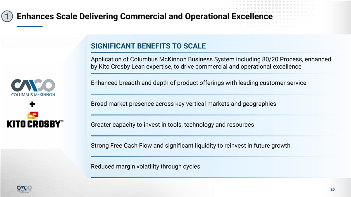Key Credit Highlights l Transforms business risk profile by leveraging scale for enhanced stability and growth, laying a strong foundation for operational excellence and strategic investments Materially increases scale 1 l Scale enables investment in digital capabilities, enhancing customer experience and expanding margins l Strengthens Columbus McKinnon’s position as a one stop shop in material handling solutions leveraging Enhanced competitive position and collective strengths of the combined business 2 incremental recurring sales l Introduces greater mix of low ASP and high-replacement consumables that drive incremental recurring sales l Meaningfully diversifies geographic sales with Kito Crosby's APAC presence, enabling the Company to navigate Complementary product portfolios and economic volatility and establish durability through cycles 3l Adds significant recurring sales from non-discretionary spending through Kito Crosby's below-the-hook Lifting geographic footprints & Securement business driven by safety-critical replacement parts l Targeting ~$70M in Annual Net Run Rate Cost Synergies through operational initiatives such as footprint and SKU consolidation Additional value creation with significant cost l Potential revenue synergy upside through cross selling and bundling products and access to additional vertical 4 synergies and revenue synergy upside markets & channels l Expanded international footprint enables delivery of a broader product suite to regions with untapped potential l Pro forma combined Company expected to double its net sales with top-tier margin profile Attractive financial performance and cash flow l CapEx-light operating models and flexible working capital structures enable cash flow resiliency 5l Complementary cash flow profiles support more consistent and resilient cash flow generation, with de- generation which enables de-leveraging leveraging as the top capital allocation priority l Third time Columbus McKinnon has raised equity to support growth over past ten years Secured equity financing with a highly l Provides a committed partner with deep operational expertise 6l CD&R will invest $800M through a PIPE and will own 42.5% of the pro forma Company with customary share credentialed partner lock-up and standstill provisions l Led by a seasoned management team with a strong track record of M&A integration and de-leveraging l Deep bench strength across commercial, operational and financial functions Long-term vision backed by proven leadership 7 l Dedicated team leading integration process, further supported by external consultants Note: Synergy estimate is preliminary and subject to change; based on Company estimates and 3rd party analysis 19