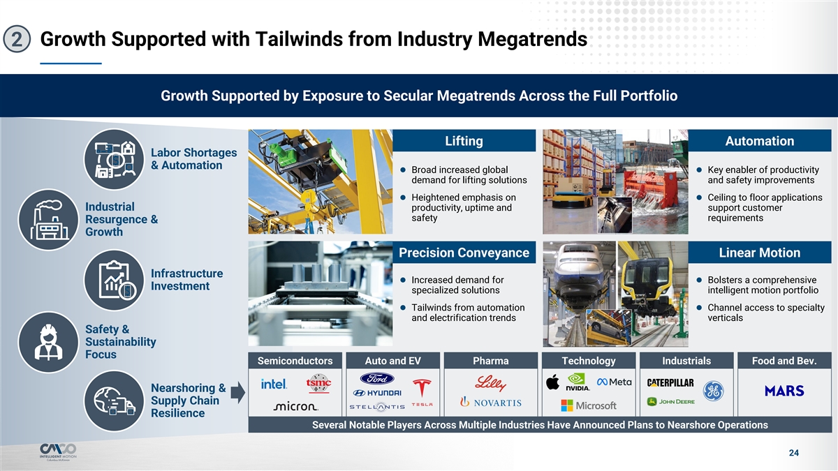 Growth Supported with Tailwinds from Industry Megatrends 2 Growth Supported by Exposure to Secular Megatrends Across the Full Portfolio Lifting Automation Labor Shortages & Automation l Broad increased global l Key enabler of productivity demand for lifting solutions and safety improvements l Heightened emphasis on l Ceiling to floor applications Industrial productivity, uptime and support customer safety requirements Resurgence & Growth Precision Conveyance Linear Motion Infrastructure l Increased demand for l Bolsters a comprehensive Investment specialized solutions intelligent motion portfolio l Tailwinds from automation l Channel access to specialty and electrification trends verticals Safety & Sustainability Focus Semiconductors Auto and EV Pharma Technology Industrials Food and Bev. Nearshoring & Supply Chain Resilience Several Notable Players Across Multiple Industries Have Announced Plans to Nearshore Operations 24