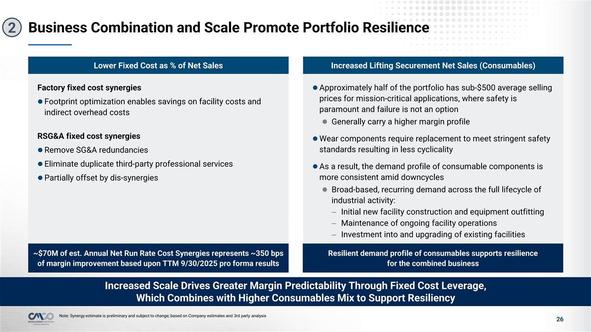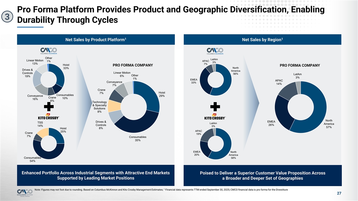 Business Combination and Scale Promote Portfolio Resilience 2 Lower Fixed Cost as % of Net Sales Increased Lifting Securement Net Sales (Consumables) Factory fixed cost synergiesl Approximately half of the portfolio has sub-$500 average selling prices for mission-critical applications, where safety is l Footprint optimization enables savings on facility costs and paramount and failure is not an option indirect overhead costs l Generally carry a higher margin profile RSG&A fixed cost synergies l Wear components require replacement to meet stringent safety standards resulting in less cyclicality l Remove SG&A redundancies l Eliminate duplicate third-party professional services l As a result, the demand profile of consumable components is more consistent amid downcycles l Partially offset by dis-synergies l Broad-based, recurring demand across the full lifecycle of industrial activity: – Initial new facility construction and equipment outfitting – Maintenance of ongoing facility operations – Investment into and upgrading of existing facilities ~$70M of est. Annual Net Run Rate Cost Synergies represents ~350 bps Resilient demand profile of consumables supports resilience of margin improvement based upon TTM 9/30/2025 pro forma results for the combined business Increased Scale Drives Greater Margin Predictability Through Fixed Cost Leverage, Which Combines with Higher Consumables Mix to Support Resiliency Note: Synergy estimate is preliminary and subject to change; based on Company estimates and 3rd party analysis 26