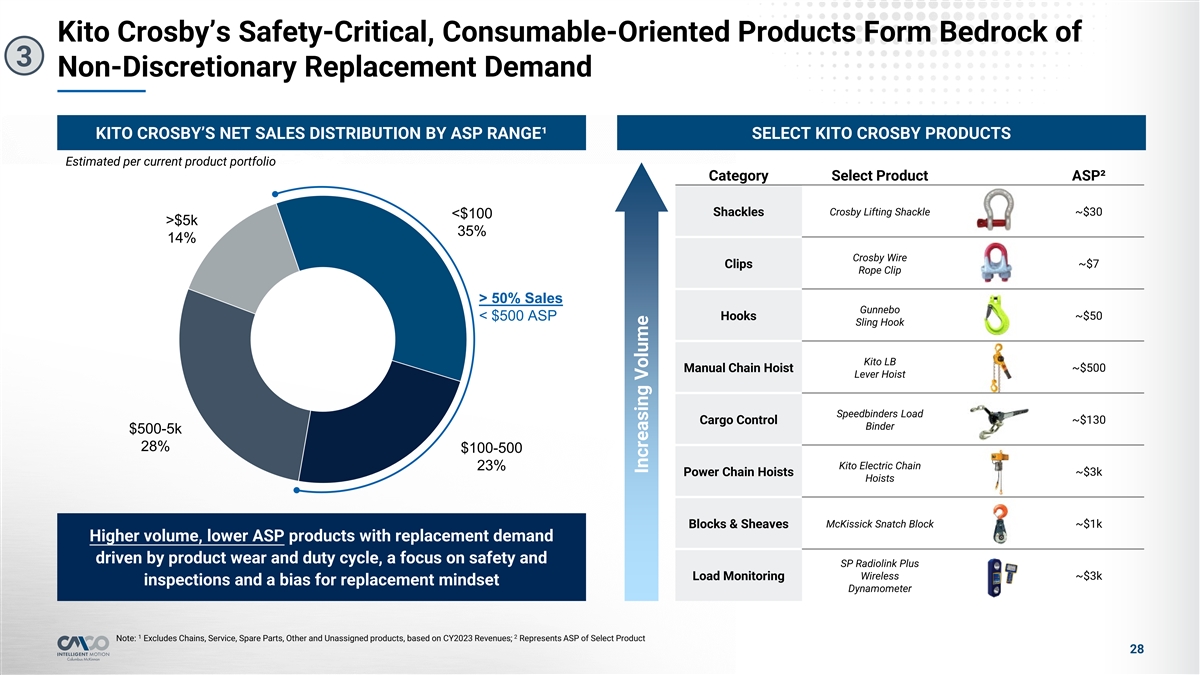 Kito Crosby’s Safety-Critical, Consumable-Oriented Products Form Bedrock of 3 Non-Discretionary Replacement Demand KITO CROSBY’S NET SALES DISTRIBUTION BY ASP RANGE¹ SELECT KITO CROSBY PRODUCTS Estimated per current product portfolio Category Select Product ASP² Crosby Lifting Shackle ~$30 Shackles <$100 >$5k 35% 14% Crosby Wire Clips ~$7 Rope Clip > 50% Sales Gunnebo Hooks ~$50 < $500 ASP Sling Hook Kito LB Manual Chain Hoist ~$500 Lever Hoist Speedbinders Load Cargo Control ~$130 Binder $500-5k 28% $100-500 Kito Electric Chain 23% Power Chain Hoists ~$3k Hoists Blocks & Sheaves McKissick Snatch Block ~$1k Higher volume, lower ASP products with replacement demand driven by product wear and duty cycle, a focus on safety and SP Radiolink Plus Wireless Load Monitoring ~$3k inspections and a bias for replacement mindset Dynamometer 1 2 Note: Excludes Chains, Service, Spare Parts, Other and Unassigned products, based on CY2023 Revenues; Represents ASP of Select Product 28 Increasing Volume