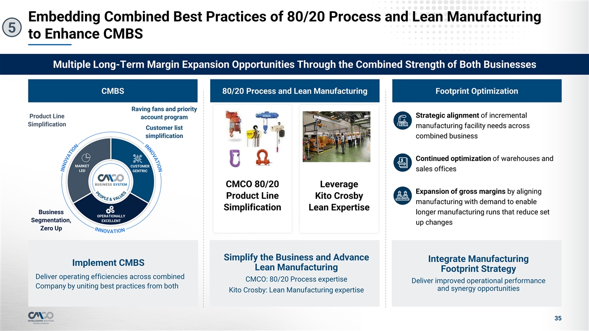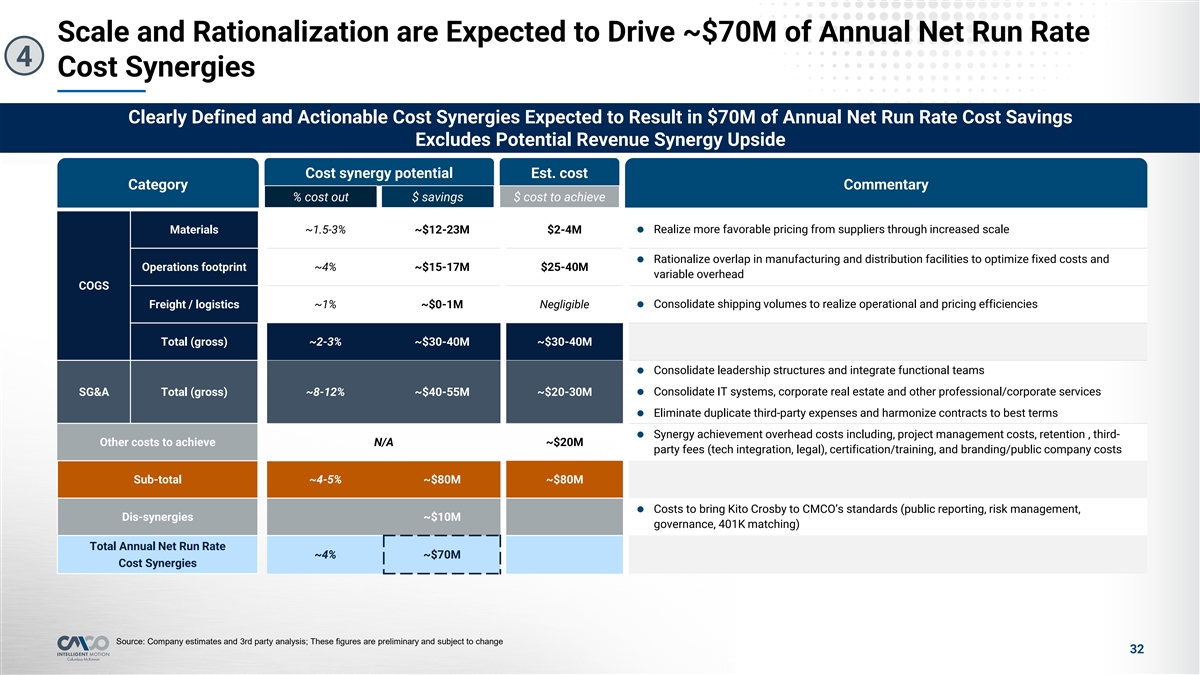Value Creation with Significant Synergies 4 Summary Of Key Synergy Areas And Corresponding Strategic Initiatives ~$80M ~$10M ~$70M Expected Annual Gross Cost Synergies Expected Annual Cost Dis-Synergies Expected Annual Net Run Rate Cost Synergies $70M Annual Net Run Rate Cost Synergies Additional Upside Expected from Revenue Synergies Procurement l Harmonize supply chain to improve key terms and procurement costs l Increase breadth and depth of product offerings to l Leverage combined spend to benefit from further volume existing customers discounts l Geographic expansion opportunities: Facilities l 80/20 and Lean processes and tools l Kito Crosby’s strong APAC footprint for CMCO products l Improve manufacturing facility efficiency; optimize for l CMCO’s LATAM & EMEA footprint for Kito Crosby products longer standard runs l Optimize distribution/warehousing for improved customer experience and better freight cost l Attract new customers with enhanced scale and combined capabilities SG&A l Eliminate overlapping technology and third-party spend l Capture share of wallet by streamlining the customer experience (e.g. auditors, insurance brokers, etc.) l Eliminate G&A and sales redundancies without impacting customer experience Note: Synergy estimate is preliminary and subject to change; based on Company estimates and 3rd party analysis 31 OVERVIEW