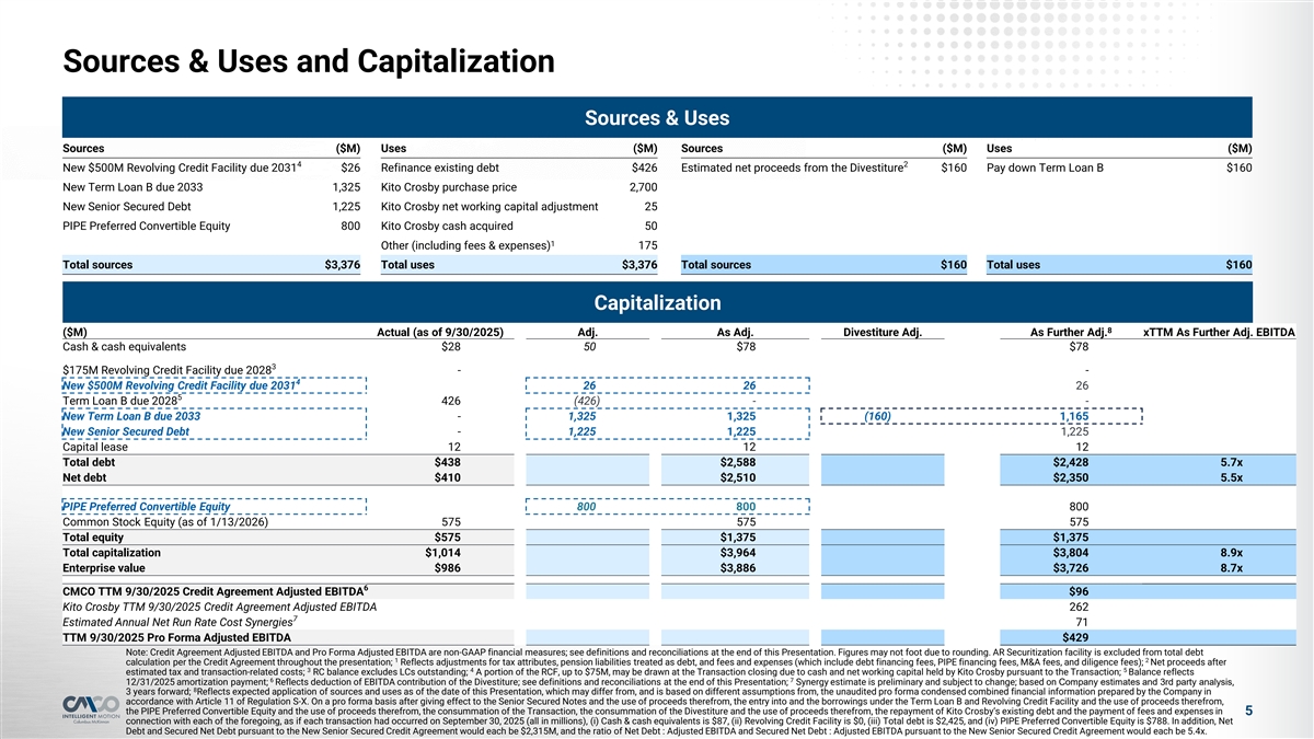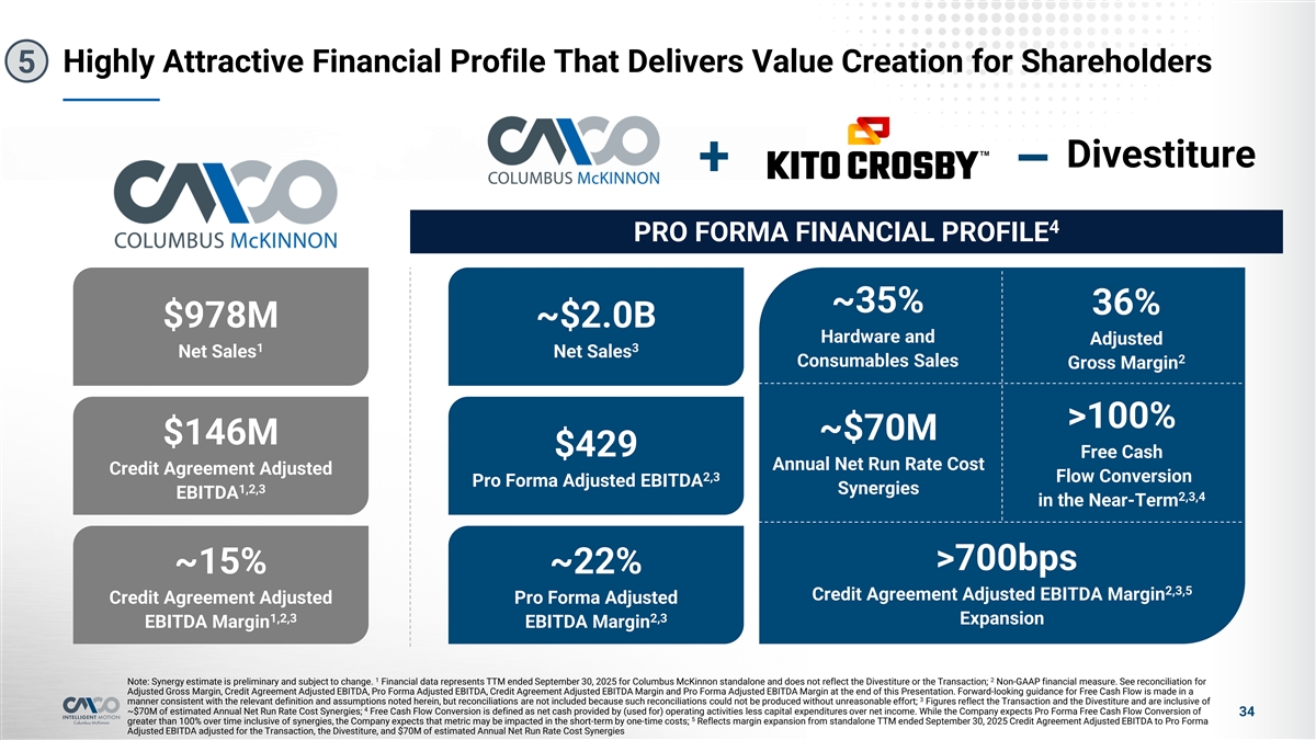 Executive Summary l Columbus McKinnon Corporation (“Columbus McKinnon,” “CMCO” or the “Company” and, after the Transaction described herein, the “combined Company”) is a global market leader in material handling and a leading global hoist manufacturer 1,2 l For the TTM period ended 9/30/2025, the Company generated Net Sales and Credit Agreement Adjusted EBITDA of $978M and $146M, respectively l On February 10, 2025, the Company entered into a definitive agreement to acquire Kito Crosby Limited (“Kito Crosby”) for an aggregate purchase price of $2.7B (the “Transaction”), subject to customary adjustments l The Transaction is expected to be funded via a combination of up to $2,550M in new debt financing and $800M in a perpetual convertible preferred equity investment from CD&R l The debt financing is expected to consist of a new 7-year $1,325M Term Loan B as well as up to a new $1,225M Senior Secured Debt raise, with a $500M Revolving 3 Credit Facility at close l Shortly after the closing of the Transaction, the Company’s pending divestiture of its U.S. power chain hoist manufacturing facility in Damascus, Virginia, its chain manufacturing facility in Lexington, Tennessee and certain other assets (the “Divestiture”) is anticipated to close with gross proceeds of approximately $210M of cash plus a potential earn out of $25M l Net proceeds are expected to be approximately $160M, after approximately $50M of expected taxes and transaction related costs l Net proceeds are anticipated to be used to pay down the Term Loan B l The Company believes the Transaction presents a compelling strategic rationale and sets the Company up for its next stage of growth and is expected to: l Increase scale substantially and extend leadership in the core lifting market l Strengthen financial profile, expanding Adjusted EBITDA Margin and bolstering cash flow generation l Create significant opportunities for synergies through procurement, facility optimization and SG&A savings, with revenue synergies as an upside l Long-term target remains 2.0x Net Leverage Ratio 1,4 l For the TTM period ended 9/30/2025, the pro forma combined Company generated ~$2.0B in annual net sales at a ~22% Pro Forma Adjusted EBITDA Margin l CD&R as-converted ownership at close is expected to be approximately 42.5% of the combined Company 1 2 Note: Credit Agreement Adjusted EBITDA, Pro Forma Adjusted EBITDA, Credit Agreement Adjusted EBITDA Margin and Pro Forma Adjusted EBITDA Margin are non-GAAP financial measures. See definitions and reconciliations at the end of this Presentation; Reflects 3 standalone TTM 9/30/2025 Credit Agreement Adjusted EBITDA, not pro forma for the Divestiture or the Transaction; A portion of the RCF, up to $75M, may be drawn at the Transaction closing due to cash and net working capital held by Kito Crosby pursuant to the 4 4 Transaction; Reflects TTM 9/30/2025 Pro Forma Adjusted EBITDA Margin, adjusted for the Divestiture and the Transaction, with ~$70M of estimated annual net run rate cost synergies included (the Annual Net Run Rate Cost Synergies ); Credit Agreement Adjusted EBITDA for TTM 9/30/2025, adjusted for the Transaction and the Divestiture, is referred to as “Pro Forma Adj EBITDA” throughout the presentation