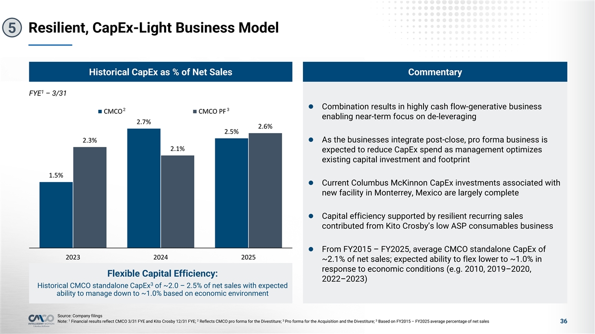 Resilient, CapEx-Light Business Model 5 Historical CapEx as % of Net Sales Commentary 1 FYE – 3/31 l Combination results in highly cash flow-generative business 2 3 CMCO CMCO PF enabling near-term focus on de-leveraging 2.7% 2.6% 2.5% l As the businesses integrate post-close, pro forma business is 2.3% 2.1% expected to reduce CapEx spend as management optimizes existing capital investment and footprint 1.5% l Current Columbus McKinnon CapEx investments associated with new facility in Monterrey, Mexico are largely complete l Capital efficiency supported by resilient recurring sales contributed from Kito Crosby’s low ASP consumables business l From FY2015 – FY2025, average CMCO standalone CapEx of 2023 2024 2025 ~2.1% of net sales; expected ability to flex lower to ~1.0% in response to economic conditions (e.g. 2010, 2019–2020, Flexible Capital Efficiency: 2022–2023) 3 Historical CMCO standalone CapEx of ~2.0 – 2.5% of net sales with expected ability to manage down to ~1.0% based on economic environment Source: Company filings 1 2 3 3 Note: Financial results reflect CMCO 3/31 FYE and Kito Crosby 12/31 FYE; Reflects CMCO pro forma for the Divestiture; Pro forma for the Acquisition and the Divestiture; Based on FY2015 – FY2025 average percentage of net sales 36