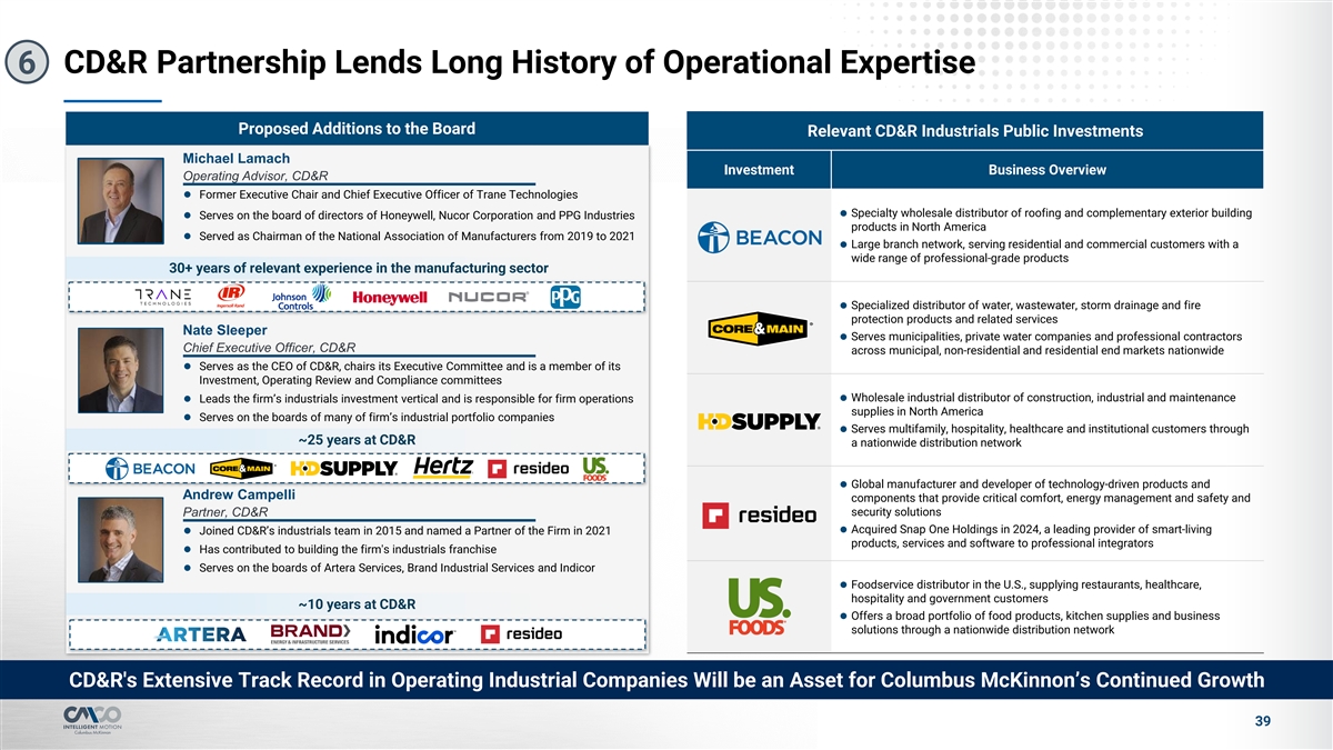CD&R Partnership Lends Long History of Operational Expertise 6 Proposed Additions to the Board Relevant CD&R Industrials Public Investments Michael Lamach Investment Business Overview Operating Advisor, CD&R l Former Executive Chair and Chief Executive Officer of Trane Technologies Specialty wholesale distributor of roofing and complementary exterior building l l Serves on the board of directors of Honeywell, Nucor Corporation and PPG Industries products in North America l Served as Chairman of the National Association of Manufacturers from 2019 to 2021 Large branch network, serving residential and commercial customers with a l wide range of professional-grade products 30+ years of relevant experience in the manufacturing sector l Specialized distributor of water, wastewater, storm drainage and fire protection products and related services Nate Sleeper l Serves municipalities, private water companies and professional contractors Chief Executive Officer, CD&R across municipal, non-residential and residential end markets nationwide l Serves as the CEO of CD&R, chairs its Executive Committee and is a member of its Investment, Operating Review and Compliance committees l Wholesale industrial distributor of construction, industrial and maintenance l Leads the firm’s industrials investment vertical and is responsible for firm operations supplies in North America l Serves on the boards of many of firm’s industrial portfolio companies l Serves multifamily, hospitality, healthcare and institutional customers through ~25 years at CD&R a nationwide distribution network l Global manufacturer and developer of technology-driven products and Andrew Campelli components that provide critical comfort, energy management and safety and Partner, CD&R security solutions l Acquired Snap One Holdings in 2024, a leading provider of smart-living l Joined CD&R’s industrials team in 2015 and named a Partner of the Firm in 2021 products, services and software to professional integrators l Has contributed to building the firm's industrials franchise l Serves on the boards of Artera Services, Brand Industrial Services and Indicor l Foodservice distributor in the U.S., supplying restaurants, healthcare, hospitality and government customers ~10 years at CD&R l Offers a broad portfolio of food products, kitchen supplies and business solutions through a nationwide distribution network CD&R's Extensive Track Record in Operating Industrial Companies Will be an Asset for Columbus McKinnon’s Continued Growth 39