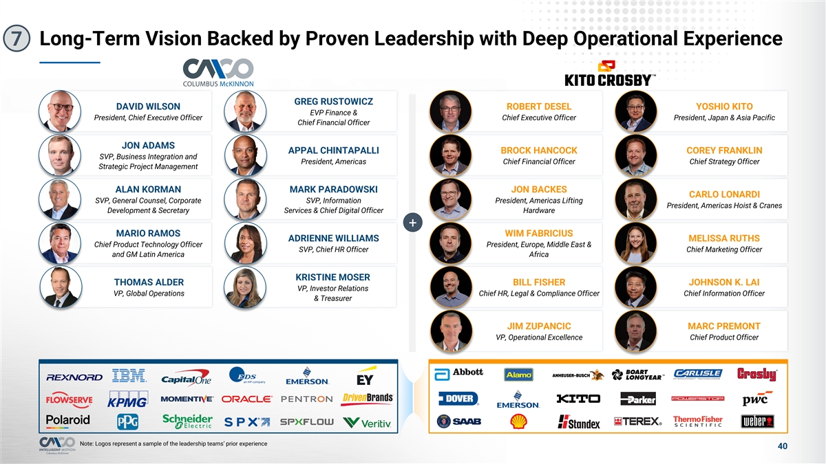 Equitizing the Balance Sheet Through CD&R Partnership 6 The Terms of CD&R's Preferred Equity Investment Create a Strong Alignment of Interests with Columbus McKinnon Key Terms Key Ownership Factors OWNERSHIP AND BOARD MEMBERSHIP: DIVIDENDS: l CD&R as-converted ownership at close is expected to be 42.5% of the Company following issuance of the Preferred l $800M Preferred equity investment subject to 7% annual dividend (PIK or cash at the Company’s option) l CD&R has the right to add three Board members to the Company’s existing nine-member Board upon closing of the Transaction, intending to l Participates in common stock dividends on as-converted basis provided designate Mike Lamach, Nate Sleeper and Andrew Campelli the Preferred will not participate in regular quarterly common stock dividends unless they exceed $0.07 per calendar quarterl CD&R’s voting rights cannot exceed 45% of all shareholders’ votes without approval LOCK-UP AND STANDSTILL: l Customary lock-up on CD&R’s shares until the later of (i) 2 years and (ii) 6 months after CD&R no longer has any board rights l Also includes customary standstill restrictions such as restrictions on CONVERSION: CD&R acquiring additional equity l Initial conversion price of $37.68 l Company may mandatorily convert the Preferred into common stock if REDEMPTION: the common share price is 200% of the conversion price for 20 of 30 l Company has option to redeem all the Preferred for cash at 200% of then- consecutive trading days current Liquidation Value l Convertible into common stock at any time at the option of CD&R l Company has option to redeem all the Preferred for cash at 150% of then- current Liquidation Value upon a Change of Control 38