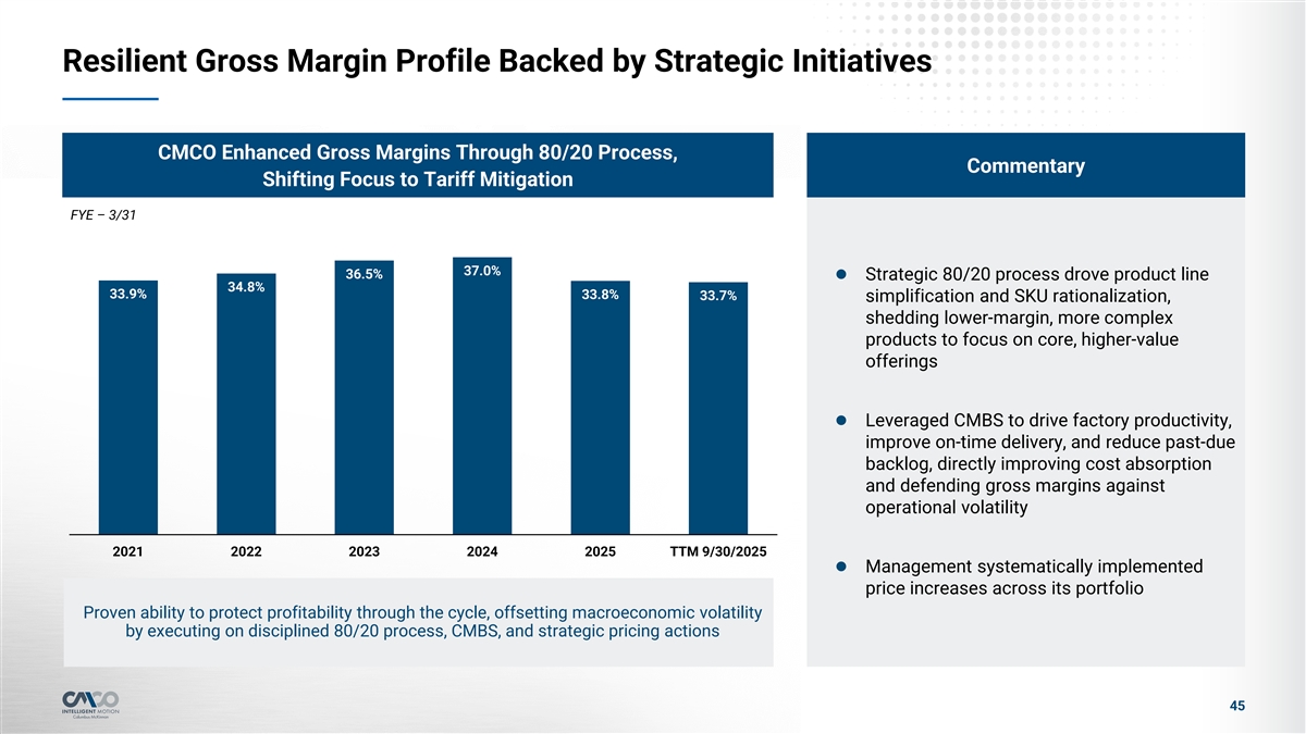 Resilient Gross Margin Profile Backed by Strategic Initiatives CMCO Enhanced Gross Margins Through 80/20 Process, Commentary Shifting Focus to Tariff Mitigation FYE – 3/31 37.0% 36.5% l Strategic 80/20 process drove product line 34.8% 33.9% 33.8% 33.7% simplification and SKU rationalization, shedding lower-margin, more complex products to focus on core, higher-value offerings l Leveraged CMBS to drive factory productivity, improve on-time delivery, and reduce past-due backlog, directly improving cost absorption and defending gross margins against operational volatility 2021 2022 2023 2024 2025 TTM 9/30/2025 l Management systematically implemented price increases across its portfolio Proven ability to protect profitability through the cycle, offsetting macroeconomic volatility by executing on disciplined 80/20 process, CMBS, and strategic pricing actions 45